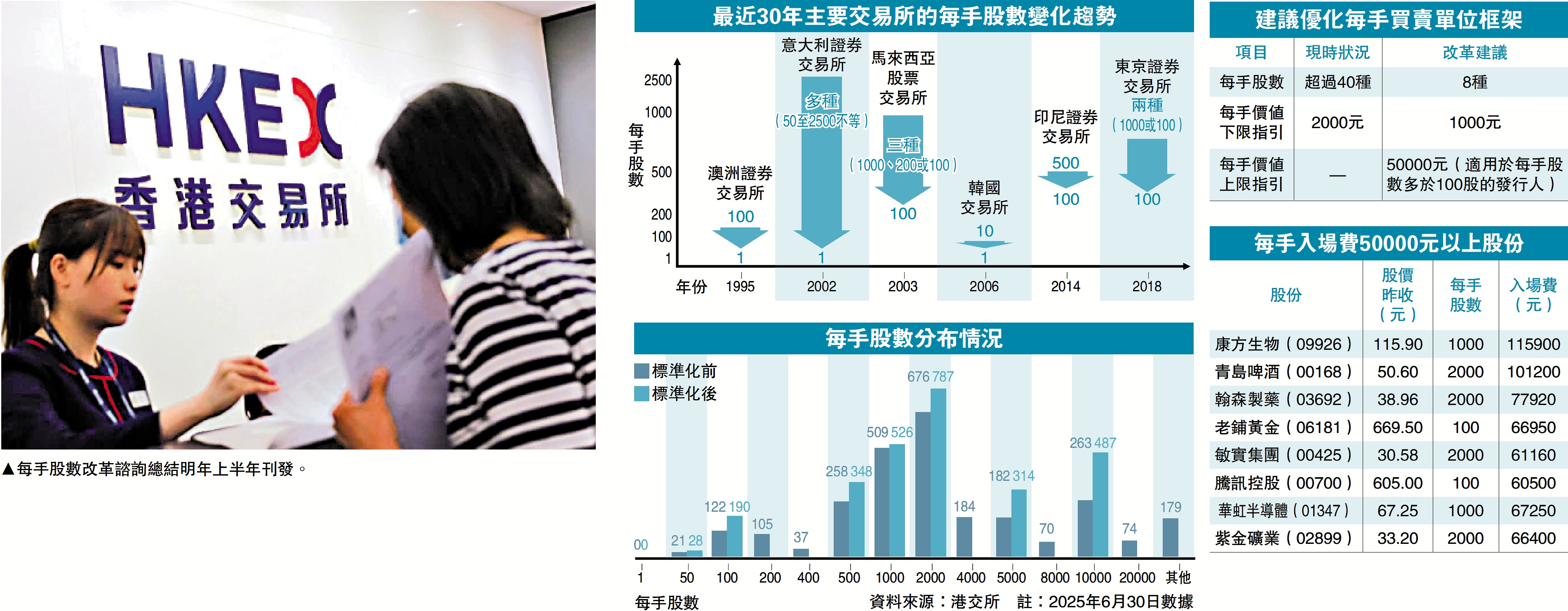 為提高港股流動性,特區政府早於2023年建立「促進股票市場流動性專責小組」,其後小組提出包括優化港股每手買賣單位的建議。港交所就有關建議終於敲定優化每手買賣單位框架,並進行公眾諮詢,截至日期明年3月12日,諮詢總結暫定於明年上半年末前刊發。