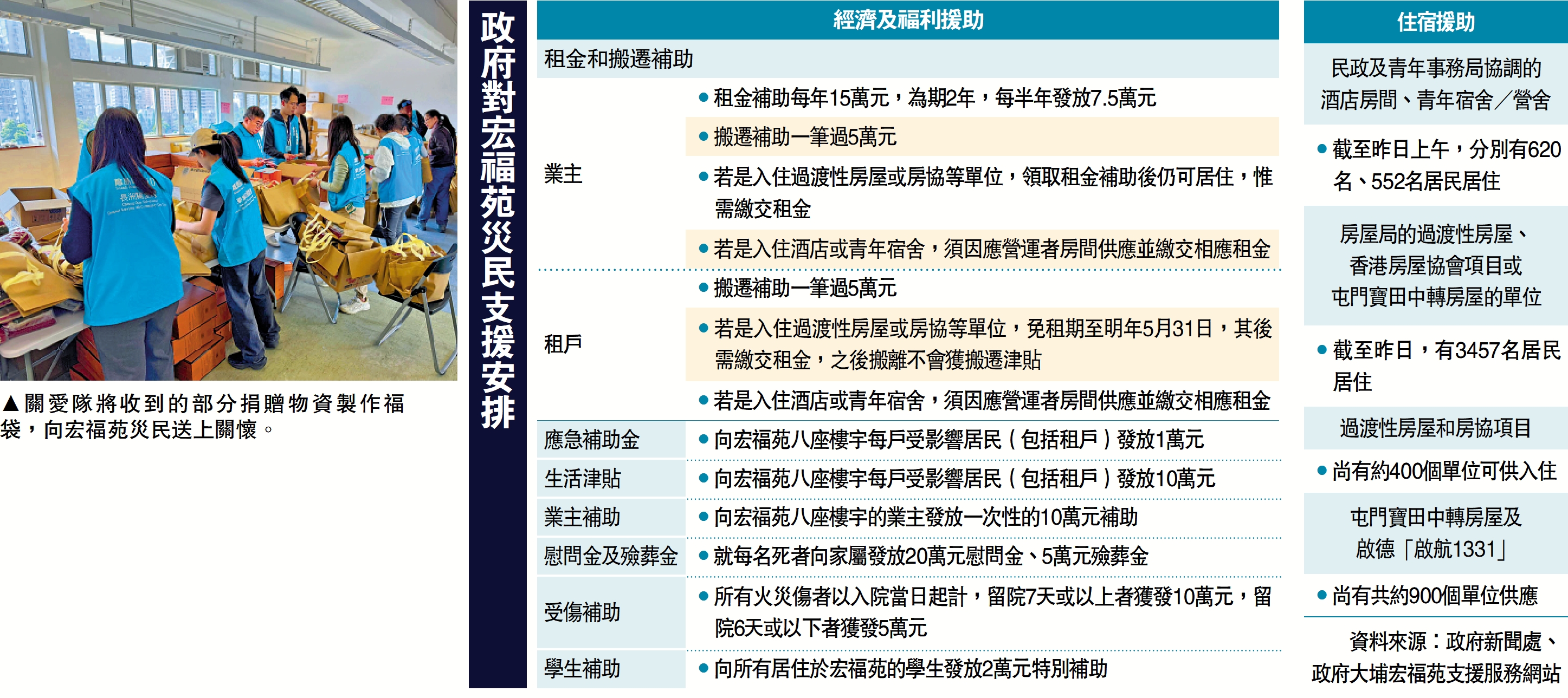 特區政府持續支援大埔宏福苑受災居民,政務司副司長卓永興昨日宣布兩項新措施,分別是向宏福苑業主每年發放15萬元租金補助,為期2年(合共30萬元),與一次性的5萬元搬遷補助,以及向宏福苑租戶發放一次性的5萬元搬遷補助。有關補助將於下周一(22日)開始,透過社會福利署「一戶一社工」機制發放。
