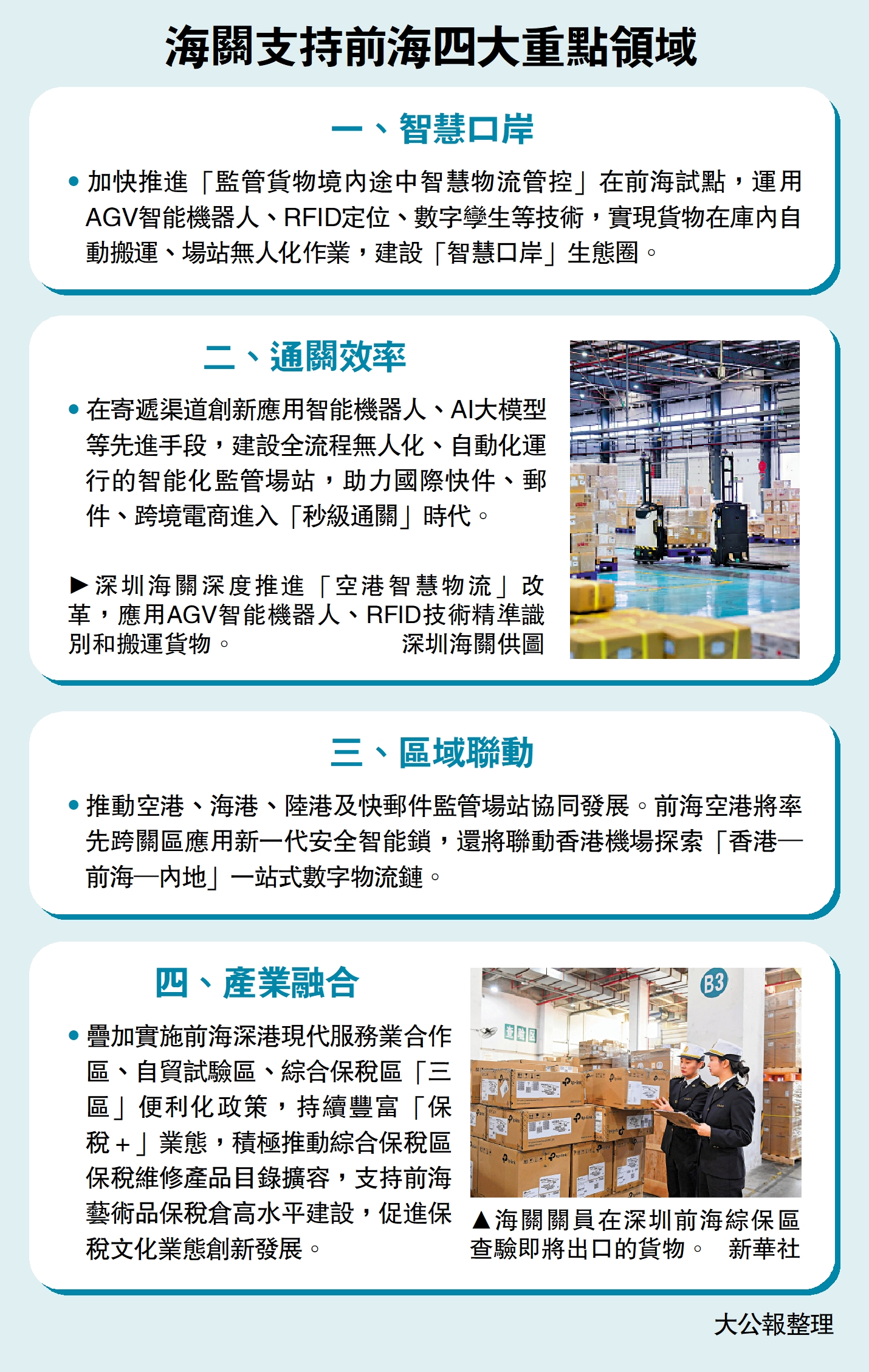 •推動空港、海港、陸港及快郵件監管場站協同發展。前海空港將率先跨關區應用新一代安全智能鎖,還將聯動香港機場探索「香港─前海─內地」一站式數字物流鏈。