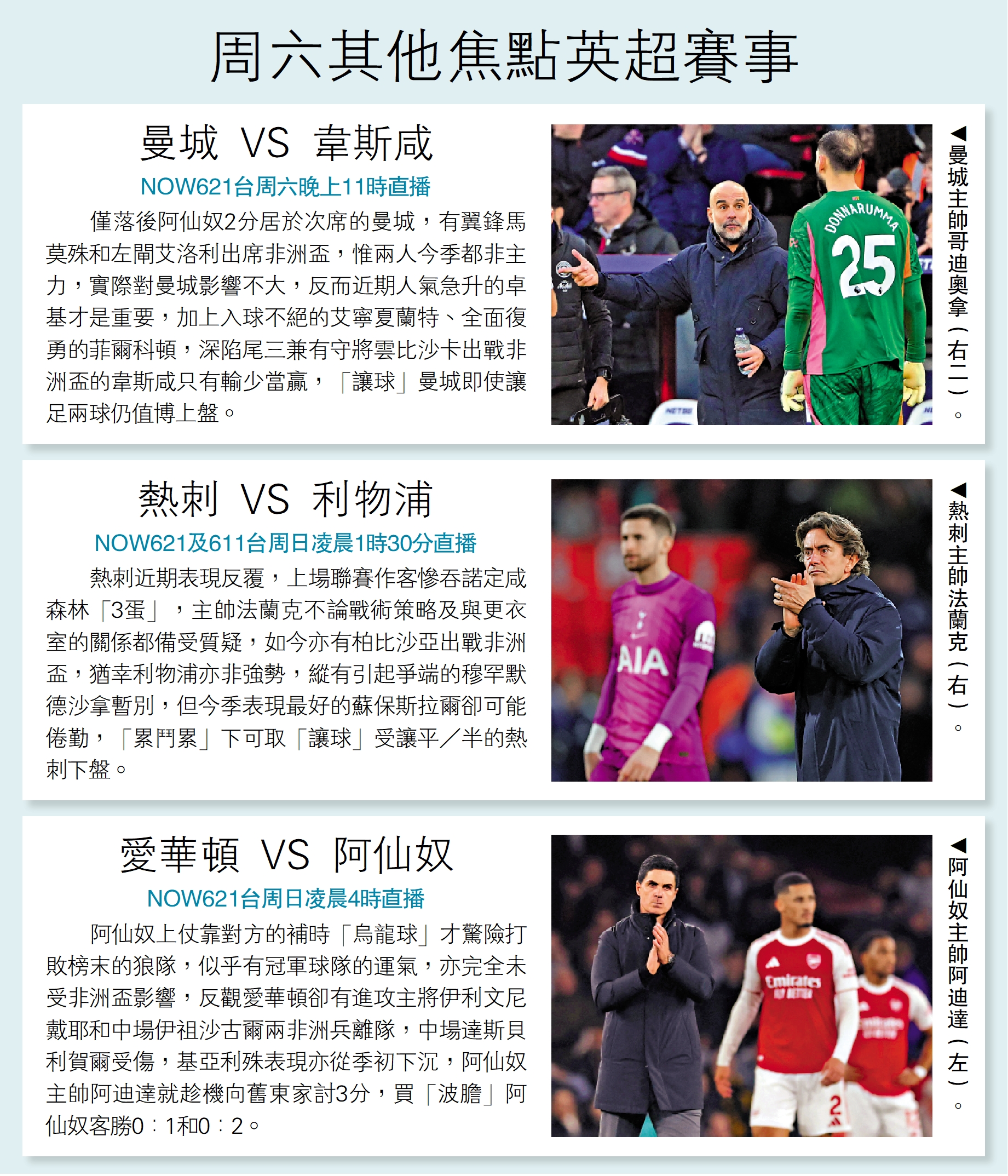 僅落後阿仙奴2分居於次席的曼城,有翼鋒馬莫殊和左閘艾洛利出席非洲盃,惟兩人今季都非主力,實際對曼城影響不大,反而近期人氣急升的卓基才是重要,加上入球不絕的艾寧夏蘭特、全面復勇的菲爾科頓,深陷尾三兼有守將雲比沙卡出戰非洲盃的韋斯咸只有輸少當贏,「讓球」曼城即使讓足兩球仍值博上盤。