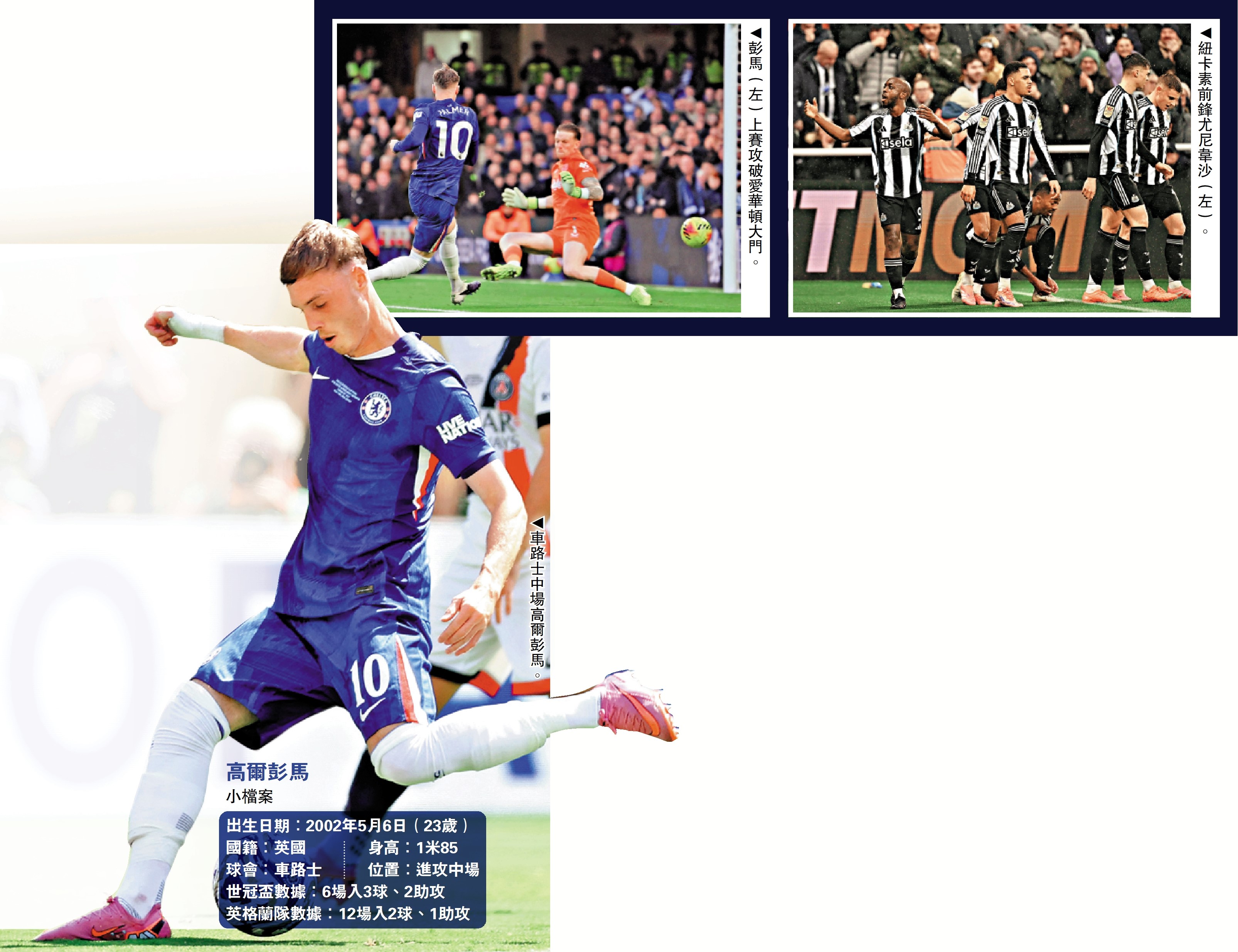 車路士中場高爾彭馬在上季完結後獲球會「升級」,球衣號碼由原本20號變為代表進攻重心的10號,之後他穿起新號碼代表球隊出戰今夏世冠盃,並以優異表現協助車路士奪標。今季季初彭馬不幸因傷缺席不少比賽,近日傷癒復出,更在上輪英超取得入球助球隊重響勝鼓,標誌着這位球隊「新10號」滿血回歸,餘下就要重現世冠盃的卓越表現,帶領車路士4線爭標之外,今晚勢必「踩盡油門」作客衝擊紐卡素。\大公報記者 譚德龍
