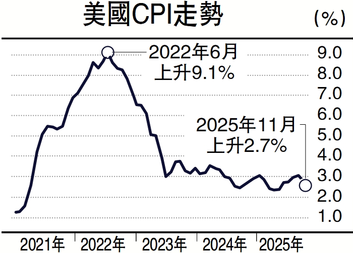 數據顯示,10至11月期間,美國CPI同比增2.7%(兩個月平均,下同),低於前值的3.0%(9月數據,下同)和預期的3.1%;環比+0.1%,低於前值的+0.3%。核心CPI同比增2.6%,低於預期和前值的3.0%;核心CPI環比0.08%,高於前值的0.23%。