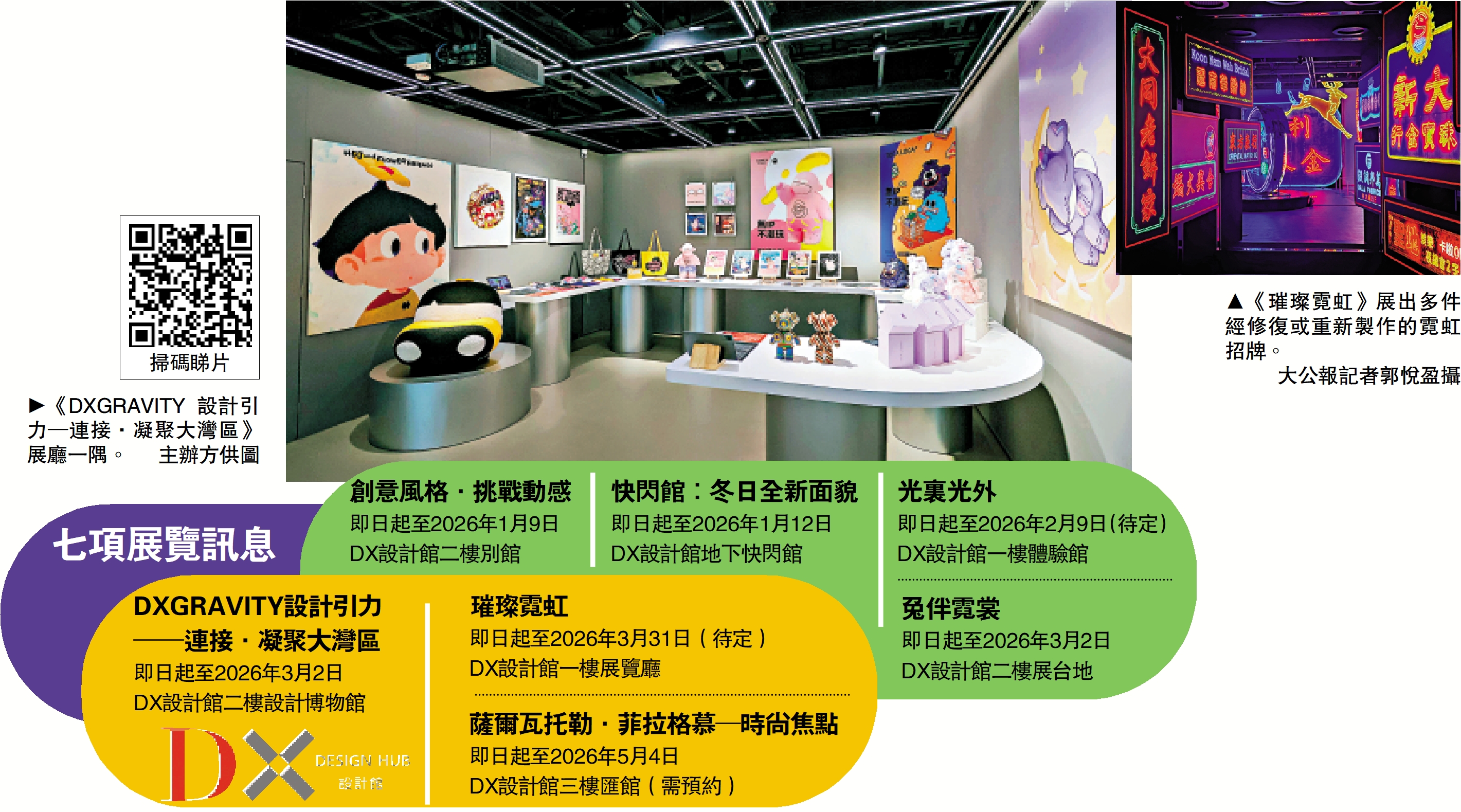 香港設計中心現正於DX設計館推出七項全新展覽與展示,包括《璀璨霓虹》、《光裏光外》、《DXGRAVITY 設計引力─連接·凝聚大灣區》展覽,以及《創意風格·挑戰動感》、《兔伴霓裳》和《薩爾瓦托勒·菲拉格慕(Salvatore Ferragamo)─時尚焦點》等創意展示。館內亦設有快閃館,展出新季時尚精品。各項展覽與展示分別從工藝、沉浸式體驗、動態設計等角度出發,涉及設計、時尚及城市文化等不同面向,公眾免費入場。\大公報記者 郭悅盈