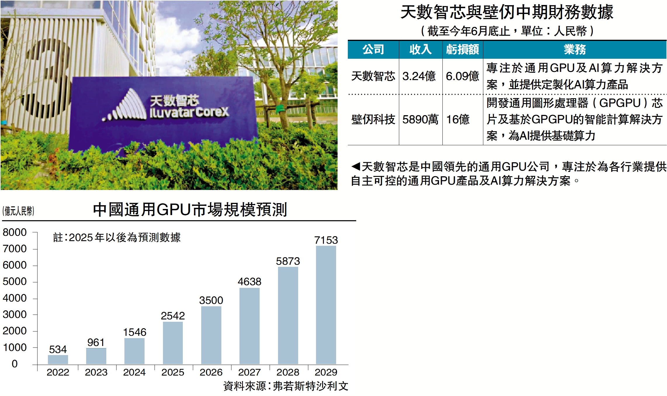 該公司產品涵蓋天垓、智鎧兩大GPU系列,提供定製化AI算力產品。截至今年6月30日,公司客戶超過290名,產品及解決方案在金融服務、醫療保健及交通運輸等行業促成逾900項部署及應用。其通用GPU產品出貨量由2022年的7800片,升至2023年的12700片,並於2024年進一步增至16800片,截至今年6月30日半年出貨量15700片。