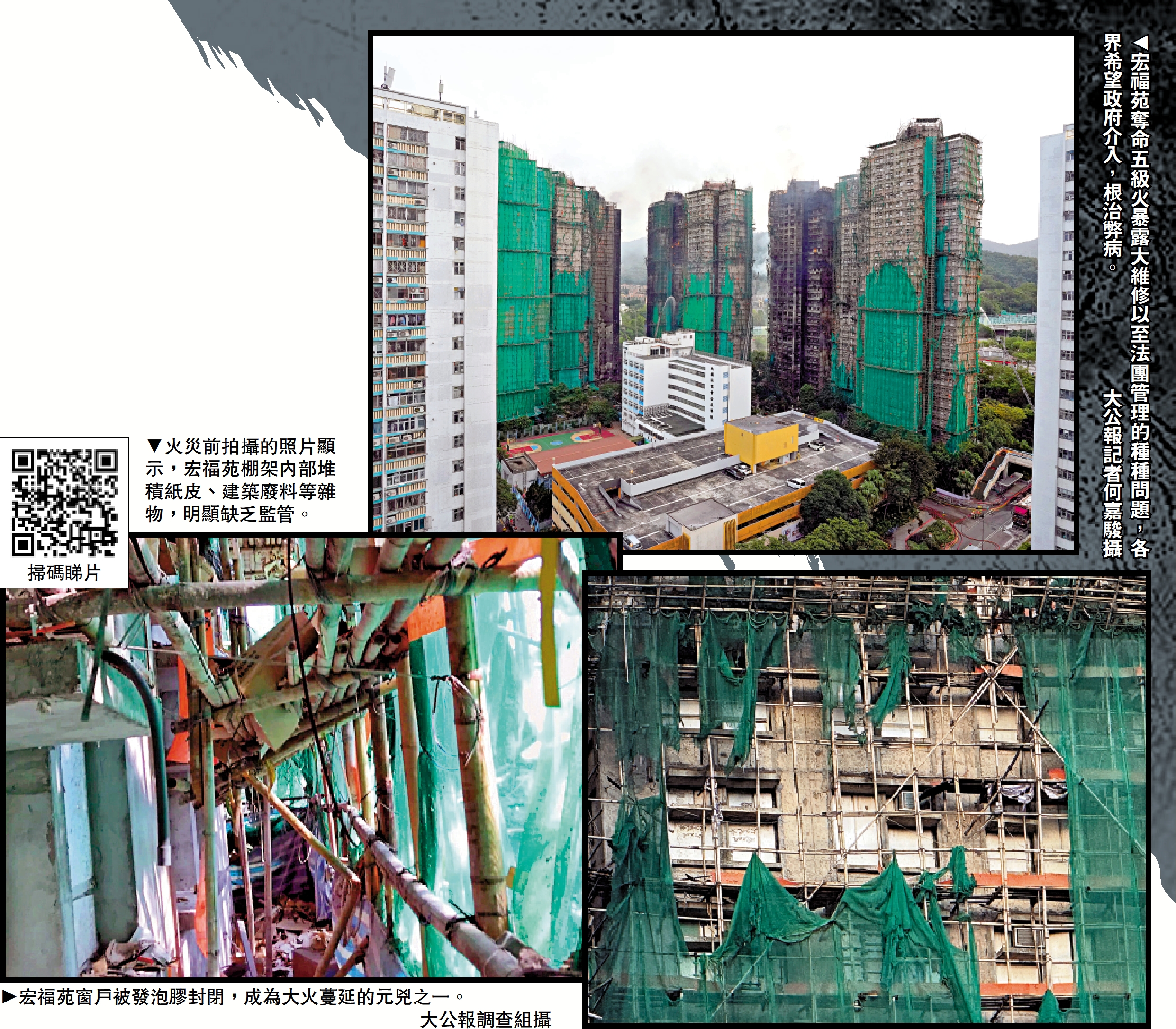 宏福苑火災暴露業主立案法團無王管,大維修工程監管系統失效。承建商宏業建築獲工程顧問打高分「化妝」,事實上宏業屢犯《職業安全及健康條例》,其承辦的維修工程層層外判,長期拖糧,加劇工地安全風險。《大公報》獨家訪問宏福苑維修工程的小判頭,透露宏業長期拖糧,工人遭層層剝削下,施工質素及監管責任難以保證及釐清。宏福苑法團會議紀錄顯示,獨立第三方的工程監督,在維修工程動工10個月後才獲法團騁用上任,工地監督已太遲。