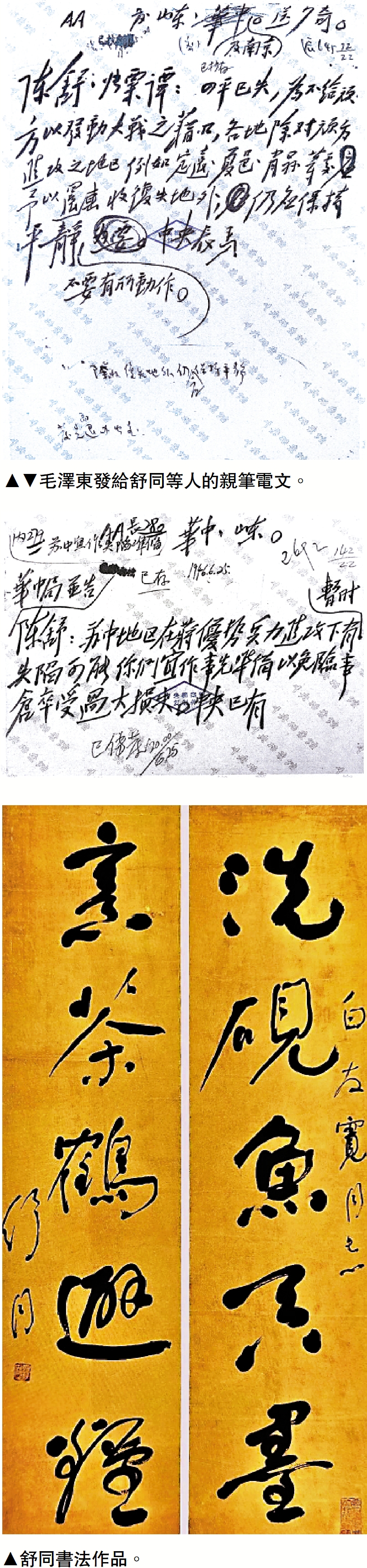 1946年6月,解放戰爭爆發,中國革命進入關鍵轉折期。舒同出任華東軍區政治部主任、華東局常委,成為華東戰場的核心指揮成員之一,與陳毅等一道肩負起保衛解放區、粉碎國民黨軍隊進攻的重要使命。這一時期,毛澤東多次親筆發電給舒同(多與陳毅等聯名),這些電文既是黨中央對華東戰場的戰略部署,更是對舒同軍事才能與戰略眼光的認可,成為還原舒同軍事指揮家本色的史料佐證。