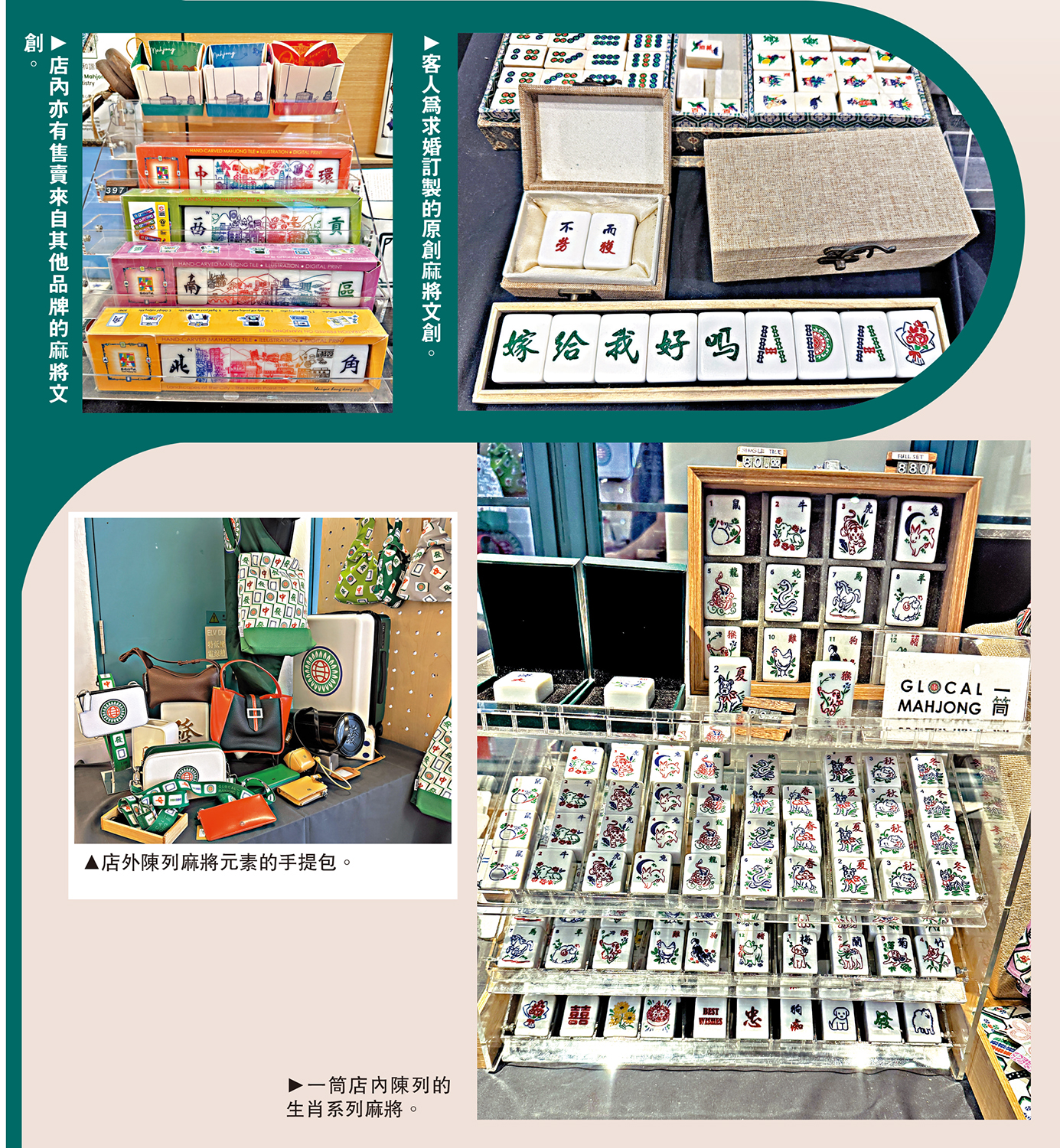 走進一筒的店舖,彷彿進入了麻將元素的收藏集合店。不少買家會選擇定製麻將來求婚或是紀念重要時刻。店內的生肖系列、家人愛稱系列、香港文化名人甚至是香港地標系列都很受歡迎。這些商品不全是由陳麗喬設計,有些是其他品牌的麻將文創放在店內售賣。陳麗喬表示,傳統手雕麻將的圖案已經固定,「而我在設計麻將的圖案時,有下功夫研究手雕麻將(字體)的筆鋒,因此我創作的產品哪怕並不是傳統的麻將牌,也能讓圖案展現『麻將味』。」