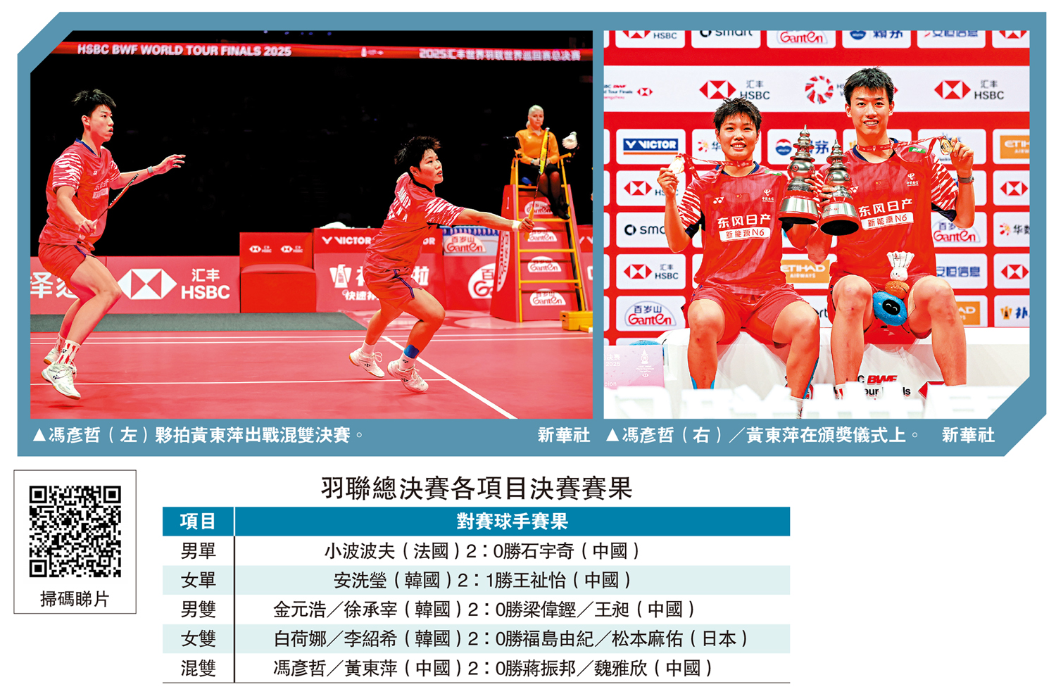 2025世界羽聯巡迴賽總決賽21日在杭州舉行決賽日,最終國家隊以1冠4亞收官。其中,混雙決賽上演「國家隊打吡」,意味必定包辦冠亞,由馮彥哲/黃東萍組成的「鳳凰組合」最終以21:12、21:17擊敗隊友蔣振邦/魏雅欣奪冠,這也是兩人合作以來首度在總決賽登頂。二人奪冠亦為中國羽毛球隊實現在混雙項目上輝煌紀錄─近10個賽季,只要參賽必然奪冠。\大公報記者 張銳