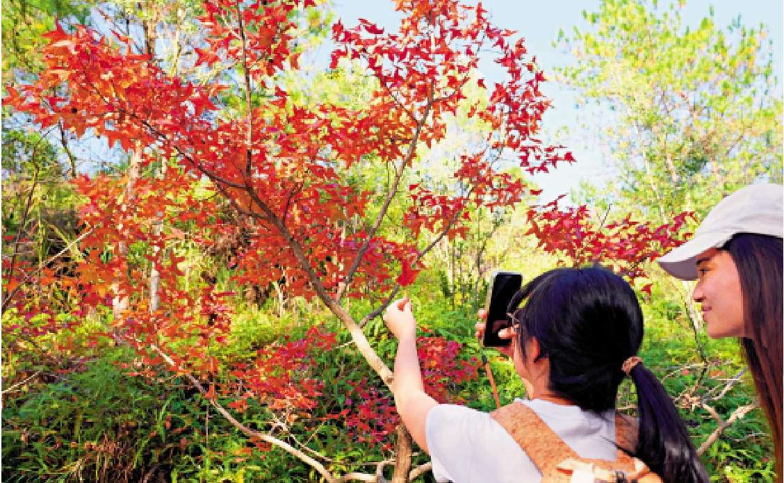 每年的元旦新年前後,正是欣賞元朗大棠紅葉時。紅彤彤的楓香林,在路旁、在山上,層林盡染,非常壯觀。近日氣溫驟降,有利樹葉變紅。漁護處昨日公布的大棠紅葉指數為「綠」色,尚未達到「紅」色級別。不過,已有不少市民和遊客專程前往欣賞紅葉。記者昨日所見,紅葉在陽光照射下發出迷人的琥珀色。有女孩將落下的紅葉仔細挑選,小心帶走,說要做成書籤;有一家大小在楓樹下拍全家福;也有內地遊客邊漫步邊開直播,與網友分享港版「紅葉秘境」。