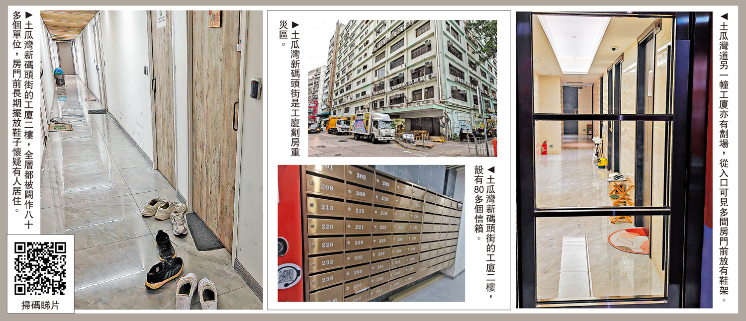 在鄰街的另一幢工業大廈一樓,一個劏了20多間細房的劏場內,有多個劏房門口都擺有鞋架,放着波鞋拖鞋及清潔用品,相信同樣有租戶居住。記者曾向一名穿拖鞋出門的女子了解租金及居住感受,對方急指自己只是找人,並警惕地快步離去。
