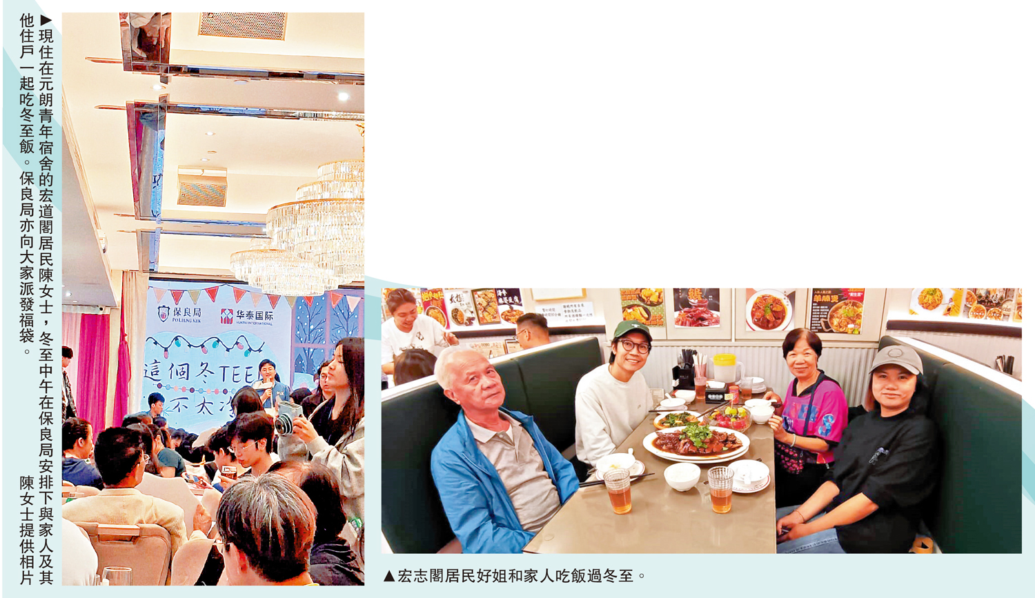 原居住在宏道閣的葉生葉太,目前住在大埔的過渡性房屋。冬至來臨,年近八旬的兩夫婦傍晚等子女收工後,一起外出去餐廳。「因為單位面積較小,不能再像以前一樣在家中煮冬至飯,所以決定外出聚餐,不論如何,能與家人共度冬至已經十分安心。」葉太說。