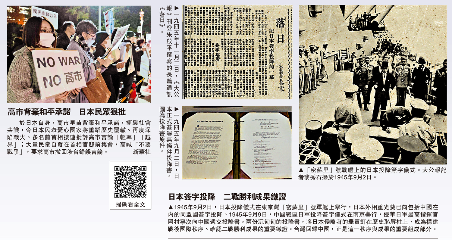 然而,就在中國人民抗日戰爭暨世界反法西斯戰爭勝利80周年之際,日本首相高市早苗卻逆潮流而動,公然在國會宣稱「台灣有事」可能構成日本可行使集體自衛權的「存亡危機事態」,暗示可能武力介入台海局勢。妄言一出,舉世嘩然。這不僅是對中國內政的粗暴干涉,更是對戰後國際秩序的公然挑釁,向世界發出了極其危險、極其錯誤的信號。