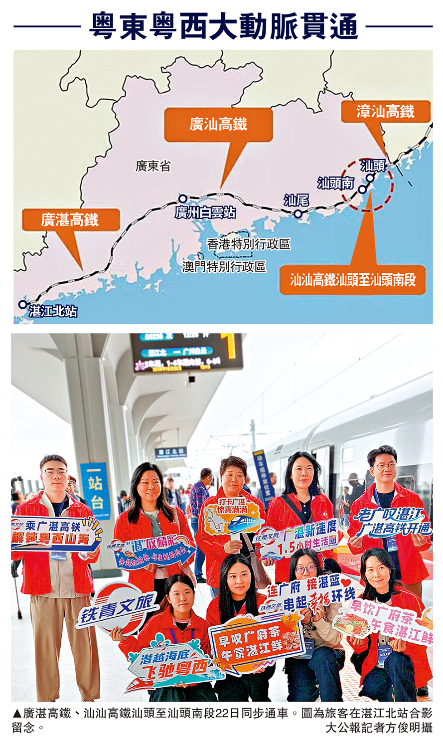 廣湛高鐵、汕汕高鐵汕頭至汕頭南段22日同步通車。這兩條高鐵線攜手已開通的廣汕高鐵,不僅形成了連接大灣區與粵西、粵東的高鐵「大動脈」,推動廣東高鐵網絡向「網格化樞紐」演進,而且將使東南沿海迎來一條縱貫南北的「超級通道」,這也意味着港人往粵東、粵西將更加方便快捷。