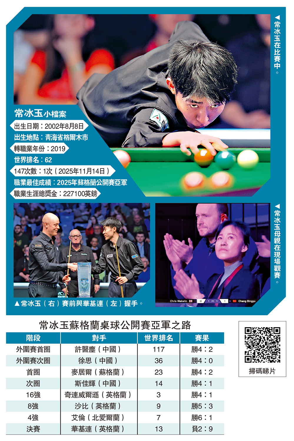 「00後」中國桌球好手常冰玉在2025年職業桌球最後一個賽事蘇格蘭桌球公開賽中,自外圍賽開始一路過關斬將,16強起連挫3名世界排名前十的好手,職業生涯首度闖進排名賽決賽。在21日的決賽中,常冰玉面對英格蘭球手華基連,雖然一度領先局數2:1,可惜最終被華基連連贏8局,以2:9敗陣屈居亞軍。儘管未能如另一中國名將趙心童在上半年一舉拿下世錦賽冠軍一戰成名,但亞軍的成績,已是這名23歲球手在個人排名賽的最佳表現。\大公報記者 梁潤森