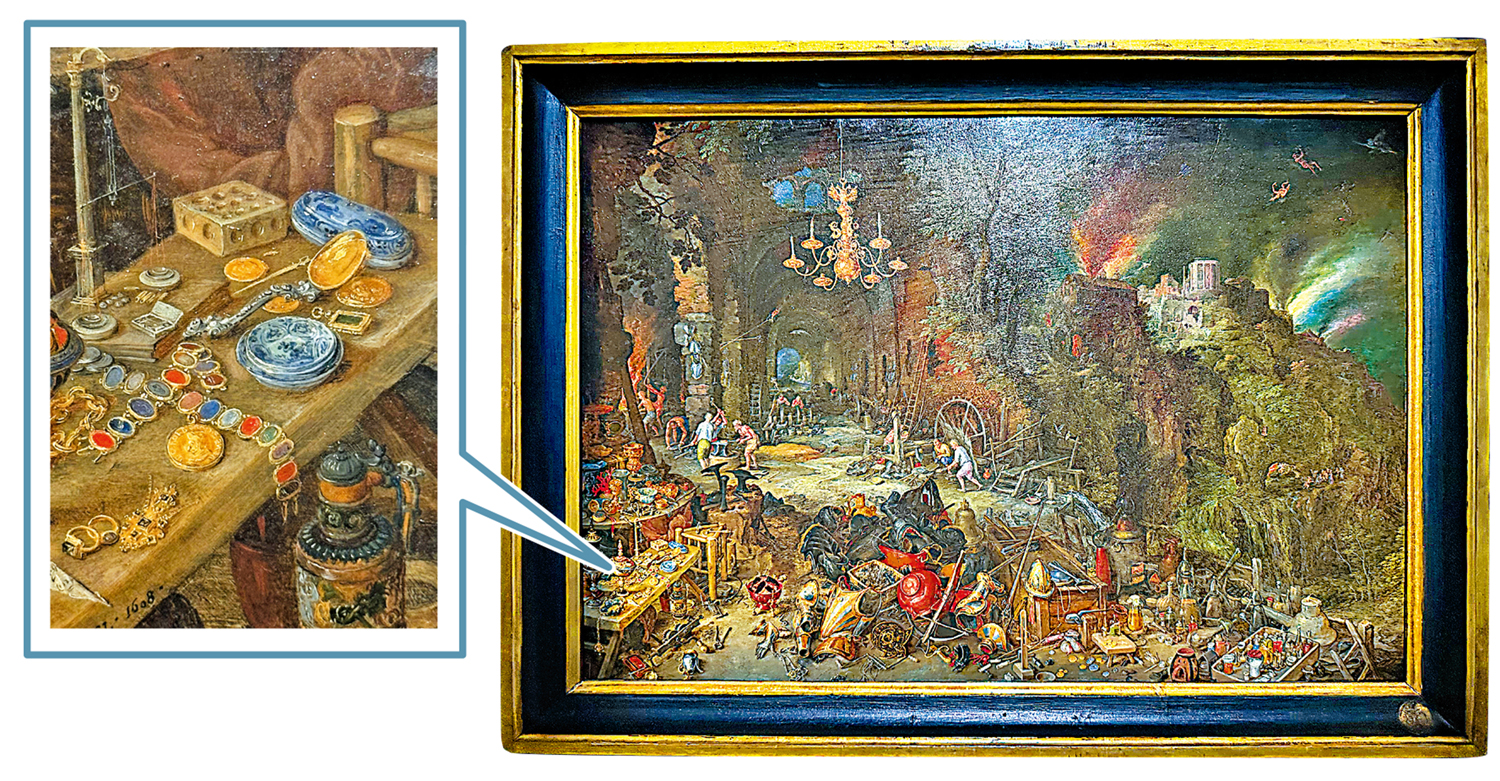 畫作的敘事背景參照了古希臘神話中愛與美之神維納斯與其丈夫、火神兼鐵匠之神赫準斯托斯的故事。後者在奧林匹斯山上有一個鍛造工廠,這裏不僅是赫準斯托斯的工作場所,也象徵着火這種源於自然、具有破壞力的元素在人的駕馭下可通過創造力轉化為鍛造工藝。老揚·勃魯蓋爾在其他火寓言主題中繪有維納斯出鏡的圖像,但她在此作中並未出現。在右側遠景的山腰處,地獄般的熊熊大火正在燃燒。而在左邊近景處的一個近似於山洞的場景內,工匠們正在各司其職地鍛造器物。紅衣主教博羅梅奧將工匠們視為神話中的獨眼巨人,雖然未在畫中的人物面容上有所體現。而整幅畫作的前景部分堪稱「絲絨勃魯蓋爾」的極致炫技。畫面正中央的部分是鋥明瓦亮的兵器盔甲,右下角擺放着各種玻璃器皿,頂端吊下來的金燦燦吊燈格外醒目。而在吊燈下方左下角的桌上,擺滿了各類燒製完成的金銀器、珠寶首飾以及瓷器。若仔細觀看,矮桌和圓桌上還分別放着明萬曆年間的青花瓷盤和瓷碗。要知道,老揚·勃魯蓋爾此作完成於一六○八年,此時風靡十七世紀尼德蘭的「華麗靜物」(Pronkstilleven)題材還未成體系,桌上的明萬曆年間青花瓷無疑成為了外銷瓷在十七世紀初已抵達尼德蘭地區的客觀證明。