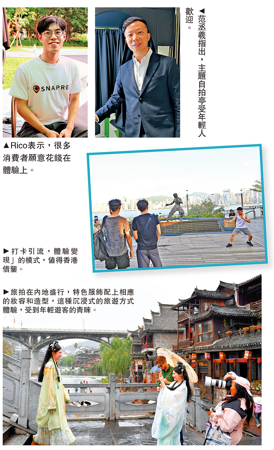 「相機先看、相機先吃」逐漸成為大多數城市人的日常,而旅拍(旅行攝影)、自拍館等新業態應運而生。攝影師預約平台Snapro聯合創辦人Rico指出,「物質會貶值,但回憶只會越來越珍貴。」他指出,現時越來越多消費者願意將錢花在體驗上,「邊感受、邊記錄」。自拍亭SNAPIO創辦人范丞羲指出,隨着社交媒體的發展,Z世代及Alpha世代對於展示自我風格有很大的需求,而相片便成為重要的情感載體。\大公報記者 李樂兒 蔣去悄