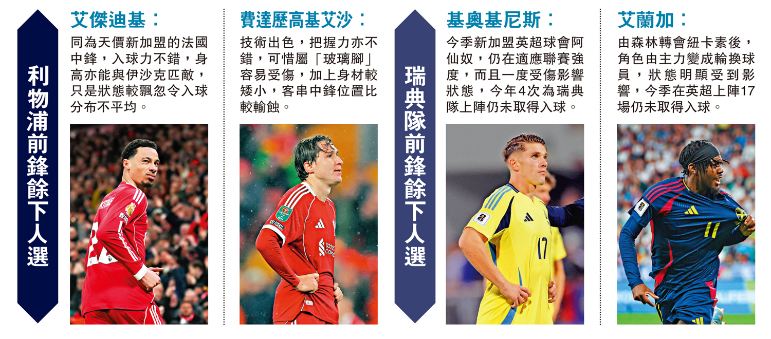 艾傑迪基:同為天價新加盟的法國中鋒,入球力不錯,身高亦能與伊沙克匹敵,只是狀態較飄忽令入球分布不平均。