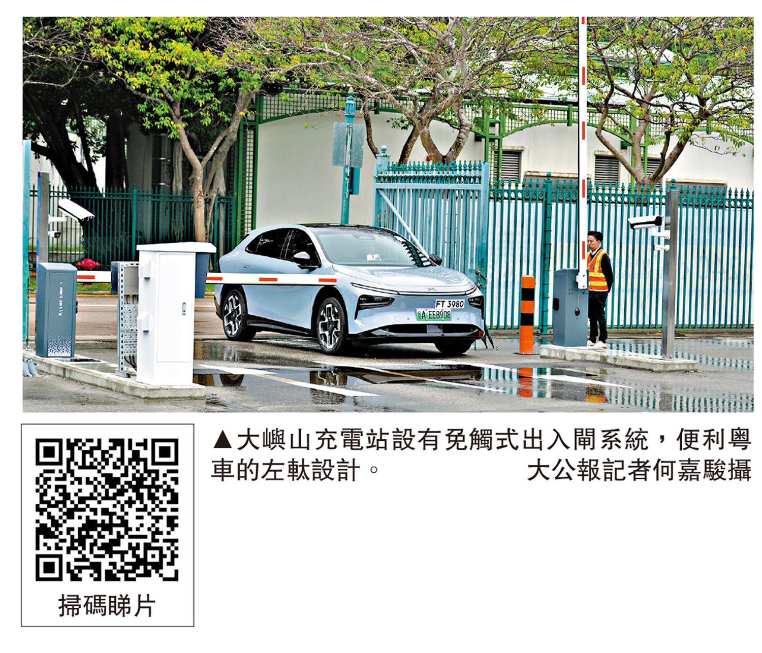 為配合粵車南下,中電源動及運輸署於大嶼山竹篙灣建設營運的電動車充電站暨粵車南下資訊中心昨日啟用,24小時營運,9個充電位包括5個國標和4個歐標充電位。有粵車車主說充電站位置方便,左軚車也可使用。