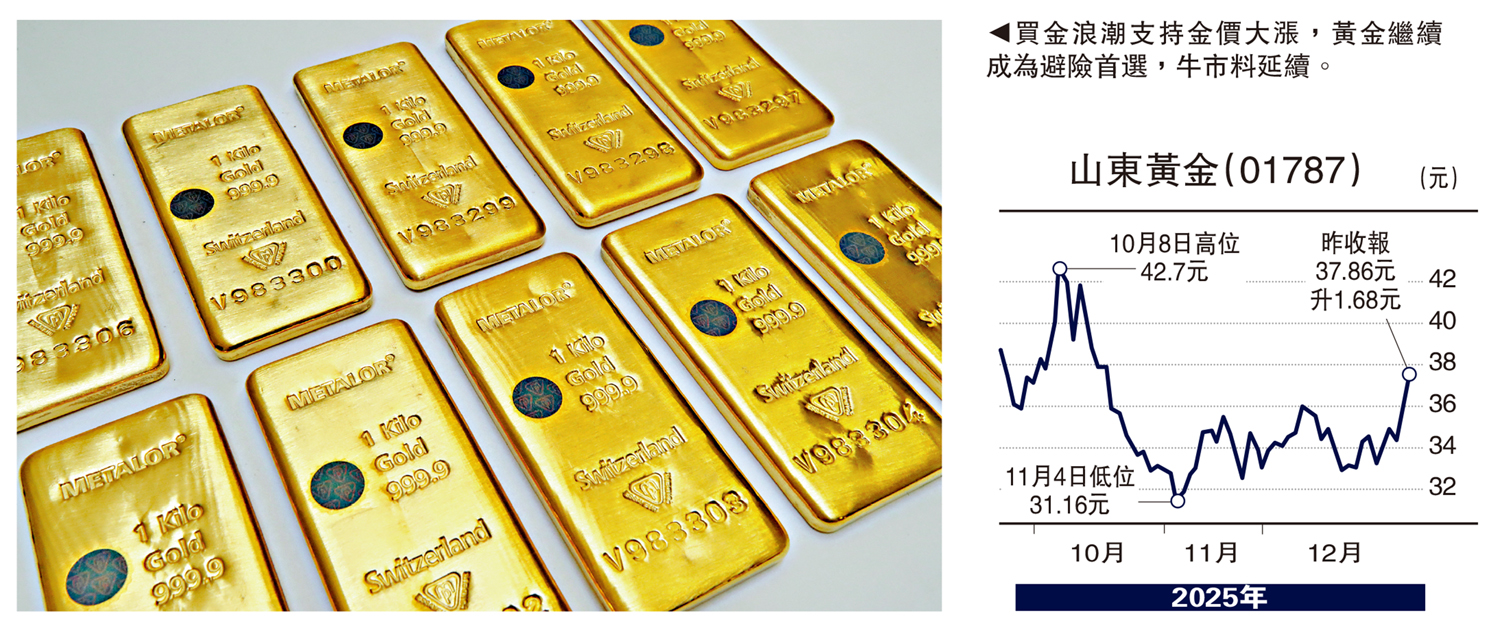 買金浪潮支持金價大漲,內地金礦股表現突出,山東黃金(01787)股價年內勁升逾兩倍。