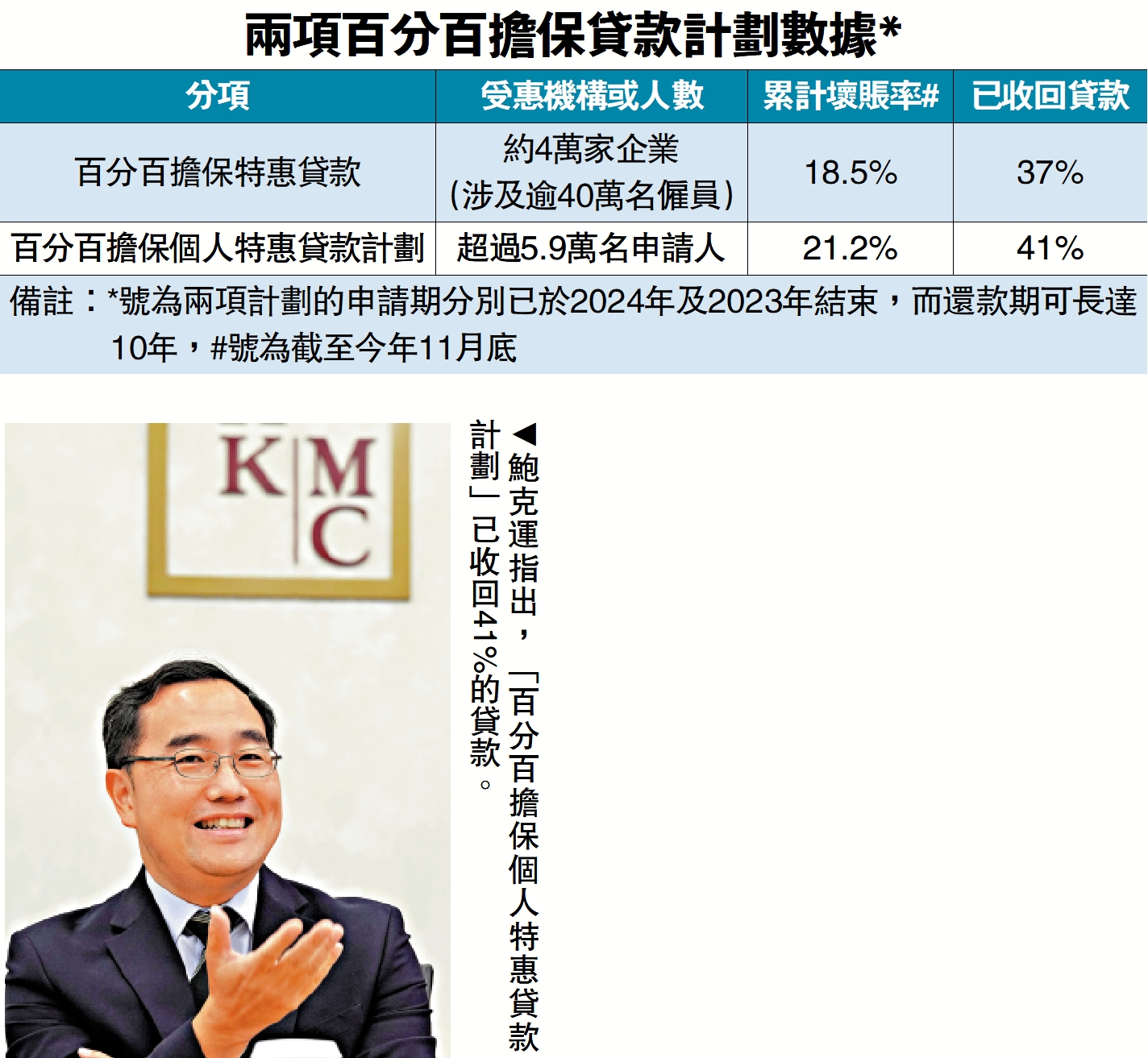 鮑克運昨日透過金管局專欄撰文表示,由於疫情持續數年,市民的生活習慣和經濟環境有所變化,部分中小企業的經營環境亦未有改善,「有機會對壞賬率添加壓力」。現時,「百分百擔保特惠貸款」和「百分百擔保個人特惠貸款計劃」已分別收回約37%及41%的貸款,其餘大部分貸款亦如期還款。