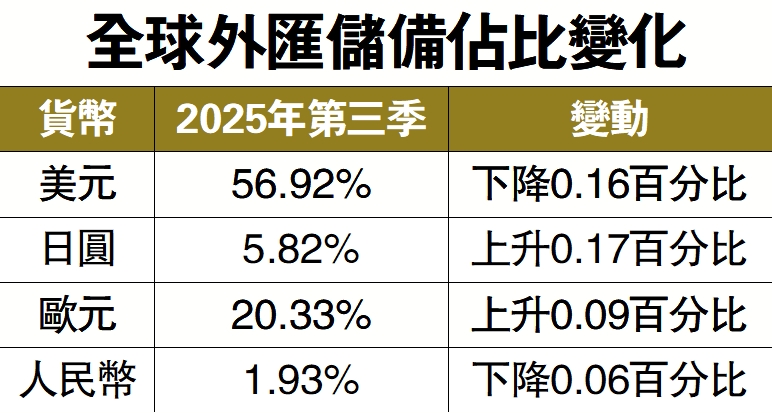 與此同時,歐元佔比則從20.24%小幅上升至20.33%。值得注意的是,人民幣佔比由1.99%略降至1.93%,而其他非主要貨幣(排除美元、歐元、人民幣)的整體佔比則由20.69%提升至20.82%,其中日圓的佔比升幅最為顯著,從5.65%升至5.82%,是本季增長最明顯的單一貨幣之一,也是推動非美元貨幣佔比上升的主力。