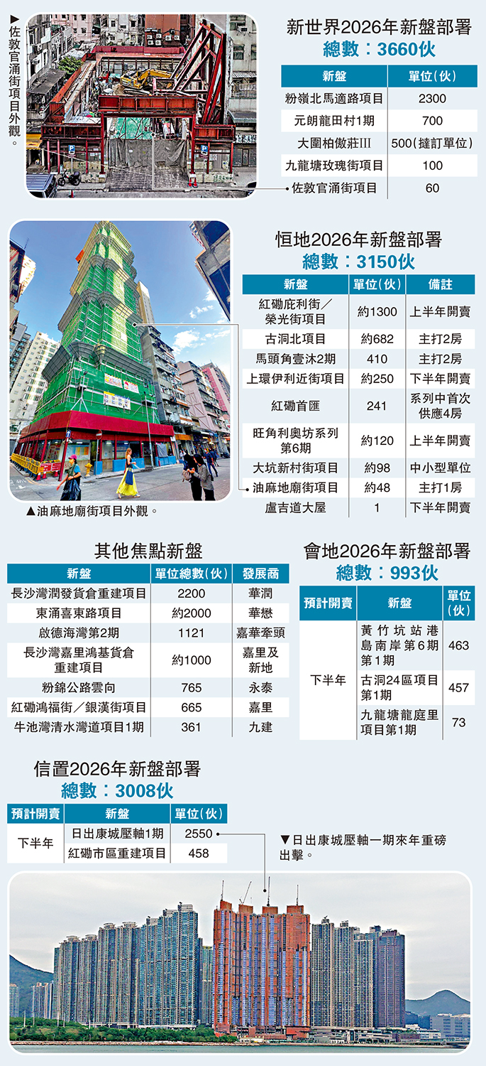 今年吸金王的新世界,來年部署有5個新盤應市,涉及單位數量3660伙,巨無霸粉嶺北馬適路項目提供2300伙,料有秩序地分批推售。