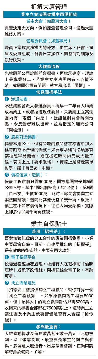 先找顧問公司診斷並寫標書,再找承建商。理論上是專業分工,若業主立案法團內有人心懷不軌,或顧問公司有問題,就容易出現「圍標」。