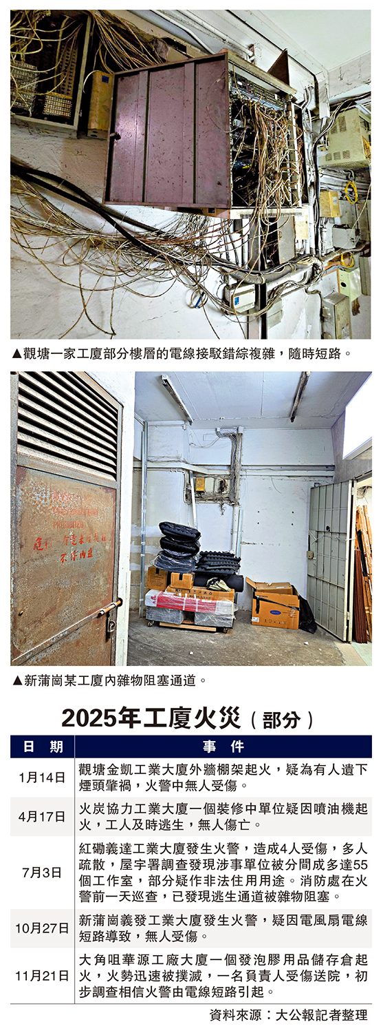大埔宏福苑五級火造成嚴重傷亡,再次喚起全港市民對防火的關注。大公報記者過去兩個月前往葵涌、觀塘、新蒲崗、土瓜灣多幢工廠大廈,了解消防設施及逃生通道狀況,結果發現部分潛藏消防安全隱患,當中有位於新蒲崗的工廈滅火筒鋪滿塵垢,標示檢查限期超過一個月,後樓梯多層也有違規吸煙情況;也有位於觀塘的工廈梯間及走廊擺放雜物,多幢工廈公共位置的電掣接駁位置,電線亂駁縱橫交錯,一旦短路發生火警,後果不堪設想。