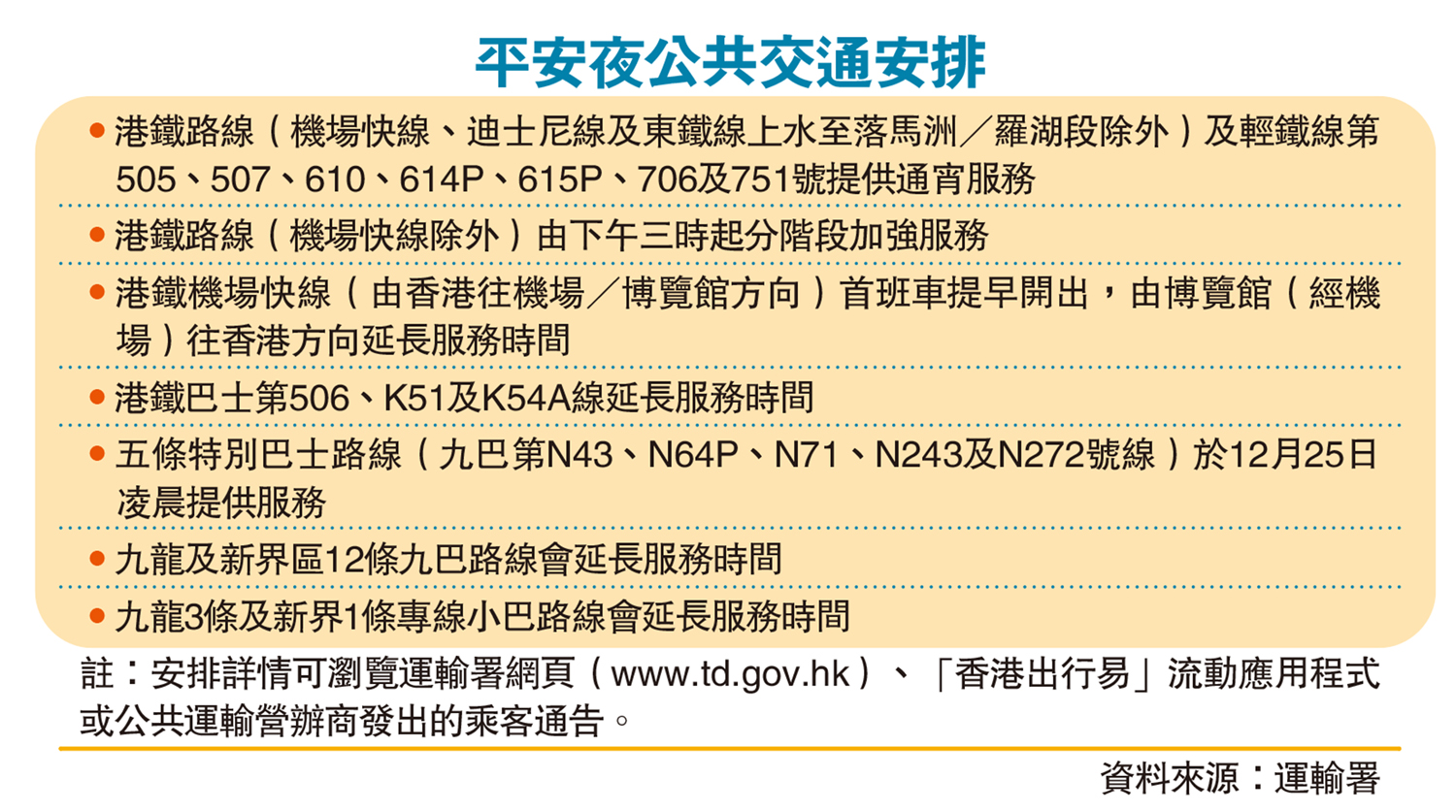 【大公報訊】記者鄭文迪報道:平安夜及聖誕節多區有節日活動,警方將於平安夜及聖誕節在部分地區,實施人流安全管理措施和特別交通安排,呼籲市民應及早規劃行程,並盡量使用公共交通服務。港鐵會在今日下午3時起加強服務,大部分路線會通宵行駛。多條九巴及專線小巴路線亦會延長服務時間,並增設特別巴士服務。