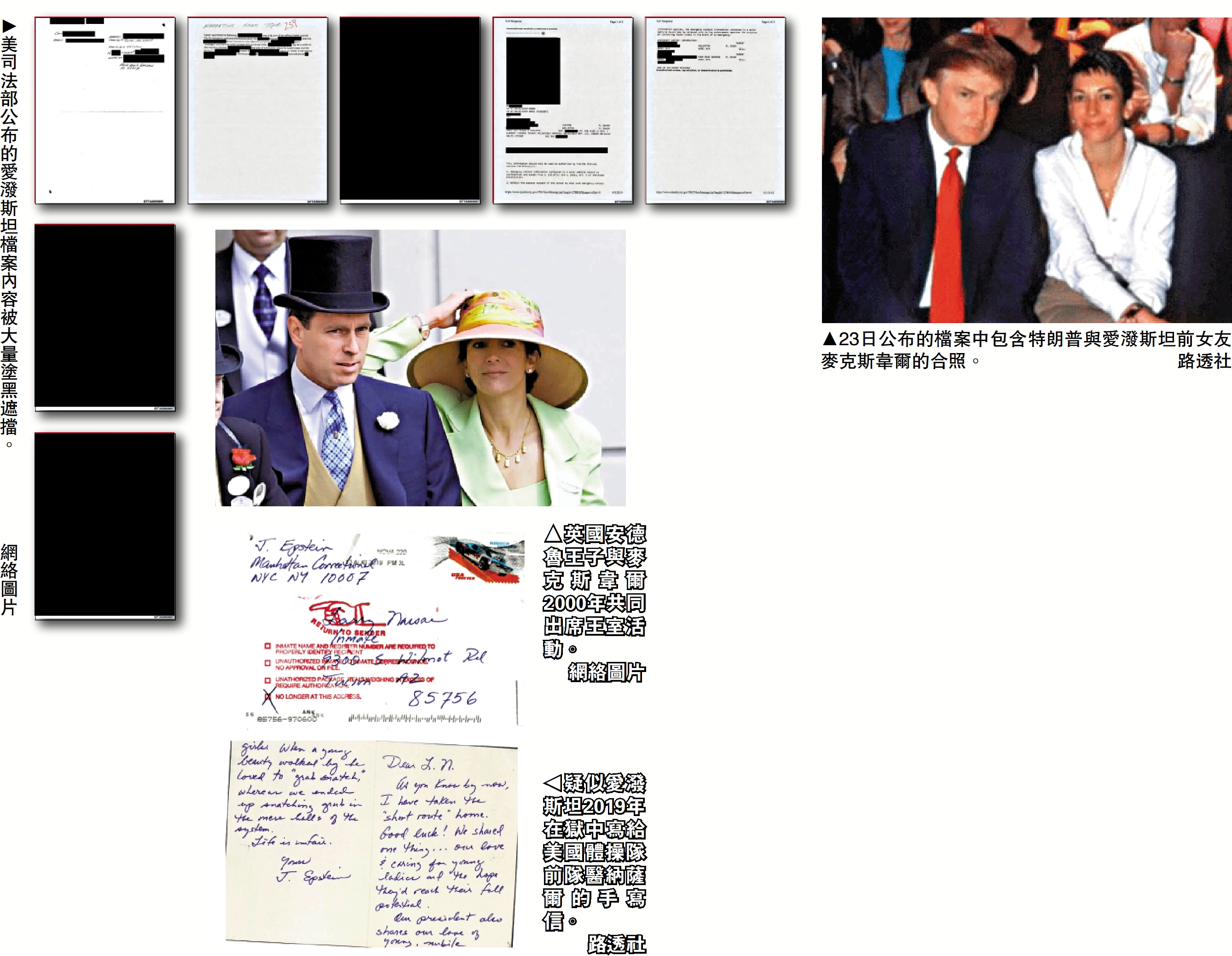 除涉及特朗普的內容外,23日公布的文件中還包括已被剝奪王室頭銜的英國安德魯王子疑似使用化名「隱形人」,給愛潑斯坦前女友兼共犯麥克斯韋爾發電郵,要求對方介紹「不正經的朋友」。