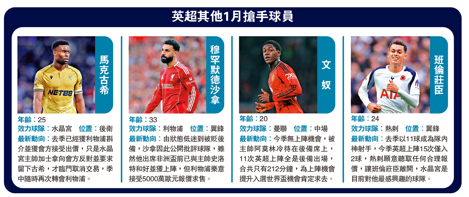 最新動向:今季無上陣機會,被主帥阿莫林冷待在後備席上,11次英超上陣全是後備出場,合共只有212分鐘,為上陣機會提升入選世界盃機會肯定求去。