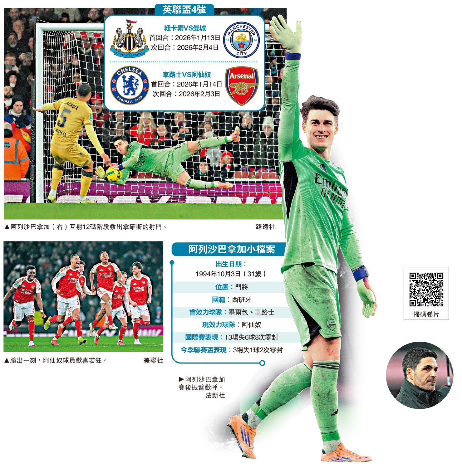 英格蘭聯賽盃8強阿仙奴主場對水晶宮24日開打,主隊憑麥辛斯拿確斯「擺烏龍」領先,水晶宮補時階段追平1:1,要互射12碼分勝負。頭7輪雙方均射入,第8輪拿確斯操刀被阿仙奴門將阿列沙巴拿加救出,這名今季集中在英聯盃上陣的門將成為贏波英雄。阿仙奴連續兩屆晉級4強,將與車路士上演倫敦打吡,爭奪決賽席位。阿列沙巴拿加賽後除分享撲救心得外,亦已經把目光放眼4強對車路士的硬仗之中。\大公報記者 梁潤森