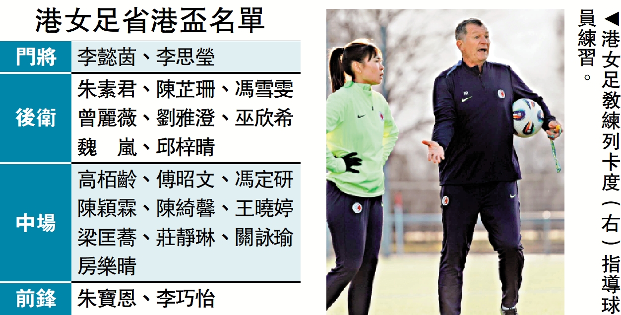 賽事方面,港女足過去6屆均不敵廣東,本屆賽事則在「以老帶新」模式下,期望憑着主場之利,讓更多年輕球員吸收比賽經驗。至於賽制,女足省港盃與男足不同,前者採取一個回合定勝負,故港女足仍有機會在一場賽事內「爆冷」取勝。