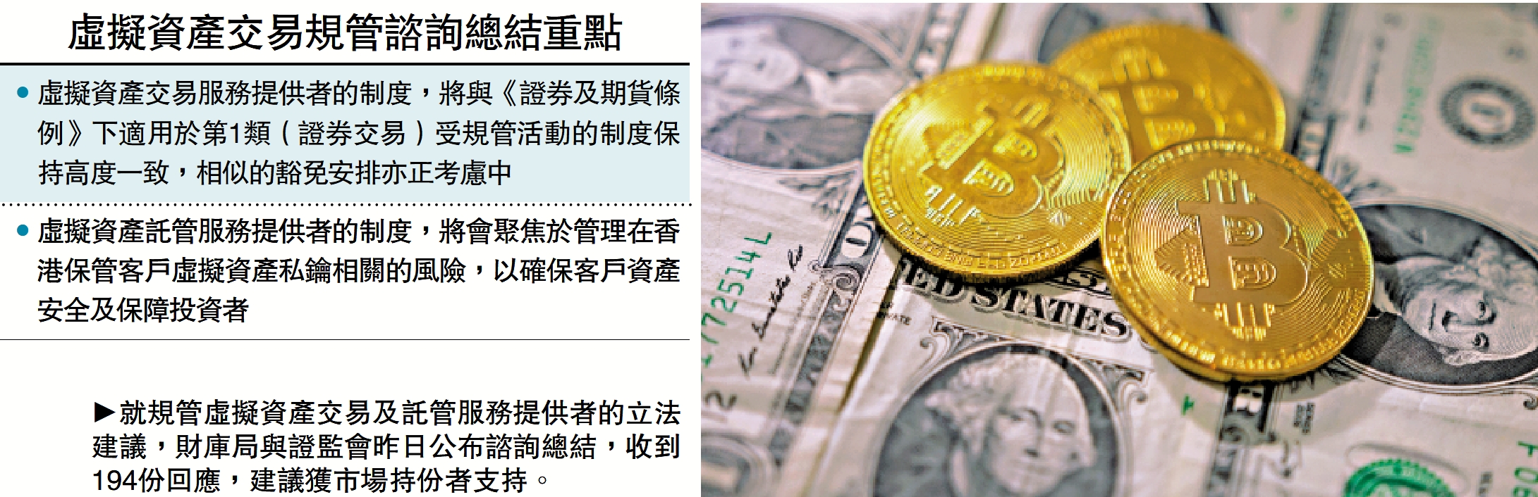 【大公報訊】財庫局與證監會昨日就有關規管香港虛擬資產交易及託管服務提供者的立法建議作出諮詢總結,是次諮詢共收到194份來自不同層面持份者的回應,獲市場廣泛支持,下一步將落實相關立法建議,形容兩項新制度是完善香港監管框架的關鍵一步,有助構建穩健及安全的虛擬資產生態圈。
