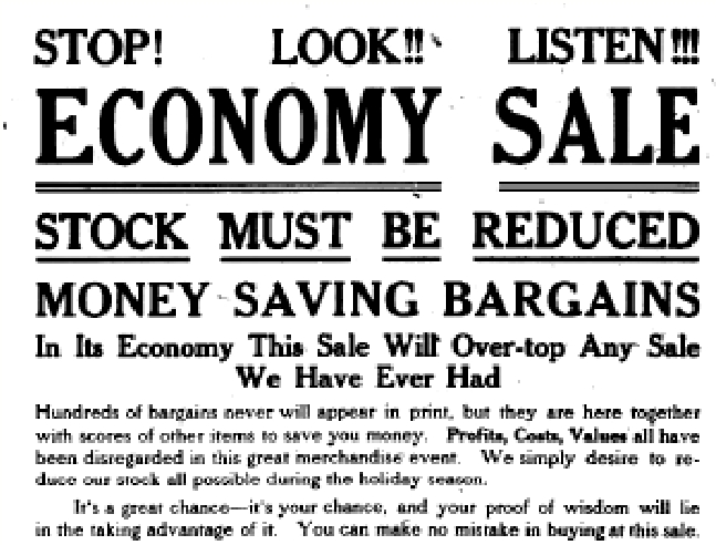 這張報紙廣告(附圖)推廣的是當地百貨於一九一三年十二月二十六日舉辦的「經濟特賣」,廣告語直言「利潤、成本、價值,在此盛大銷售中皆被擱置,我們只求於假日季盡可能清空存貨」。語氣急切,可見當時商家已開始善用節後時機,清理聖誕庫存。值得一提的是,當時「Boxing Day」一詞在當地報章尚未普及,直至一九二○年代後才逐漸流行。這則廣告如同一扇小窗,映照出二十世紀初Boxing Day商業化的萌芽。
