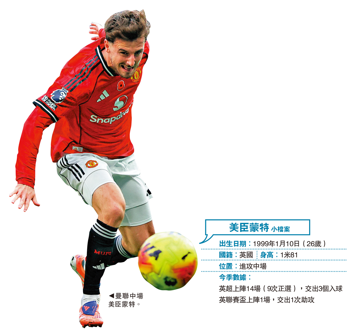 美臣蒙特在2023年夏天由車路士轉投「紅魔鬼」曼聯後,首兩季不斷受到傷患困擾,在醫療室的時間遠多於在球場上,直至今季球迷才見到一個獲「正常時間上陣」的蒙特,而他暫時在英超正選列陣的次數亦已是加盟以來最多的一季。曼聯目前正值最艱難時刻,除有多名非洲主力離隊外,更有隊長般奴費南迪斯因傷缺陣,球迷期待蒙特挺身而出,由「容易受傷的男人」變成「取代般奴的主力」,以無負穿上球隊最標誌性之「7號」球衣的責任。\大公報記者 譚德龍
