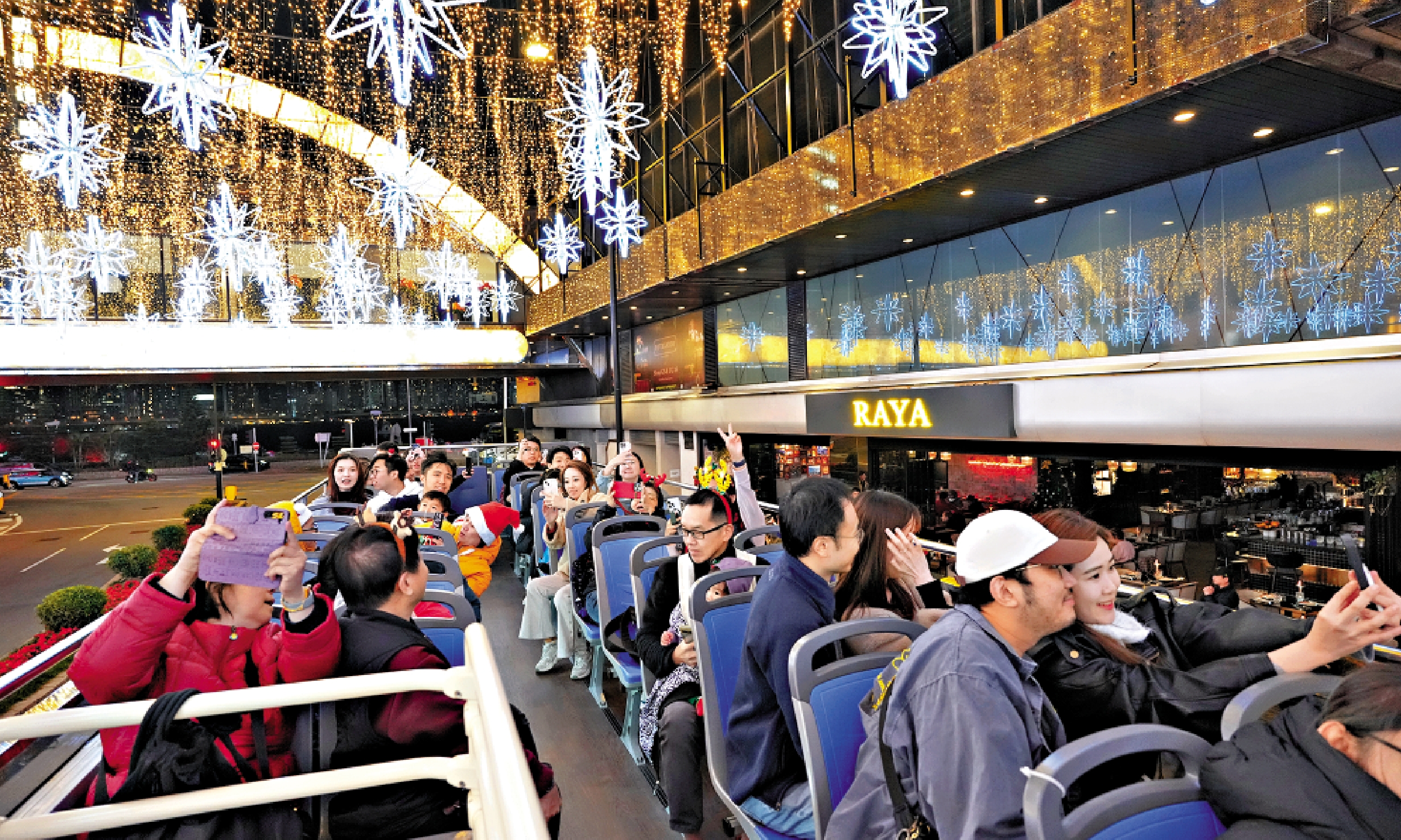 【大公報訊】記者王亞毛報道:聖誕期間,香港節日氣氛濃厚,吸引不少內地旅客來港。入境處數據顯示,前日平安夜整體訪港旅客接近15萬人次,較去年上升近12%,包括超過10萬名內地旅客,海外訪港旅客人次更按年上升19%;昨日聖誕截至晚上9時,整體訪港旅客有約12萬人次。城巴因應節慶活動推出H2C冬日開篷巴士班次,大公報記者昨日在開篷巴士團現場直擊,與40多名乘客坐在巴士上層,穿梭中環、灣仔和尖東欣賞聖誕燈飾,市民和遊客大讚是新奇體驗。
