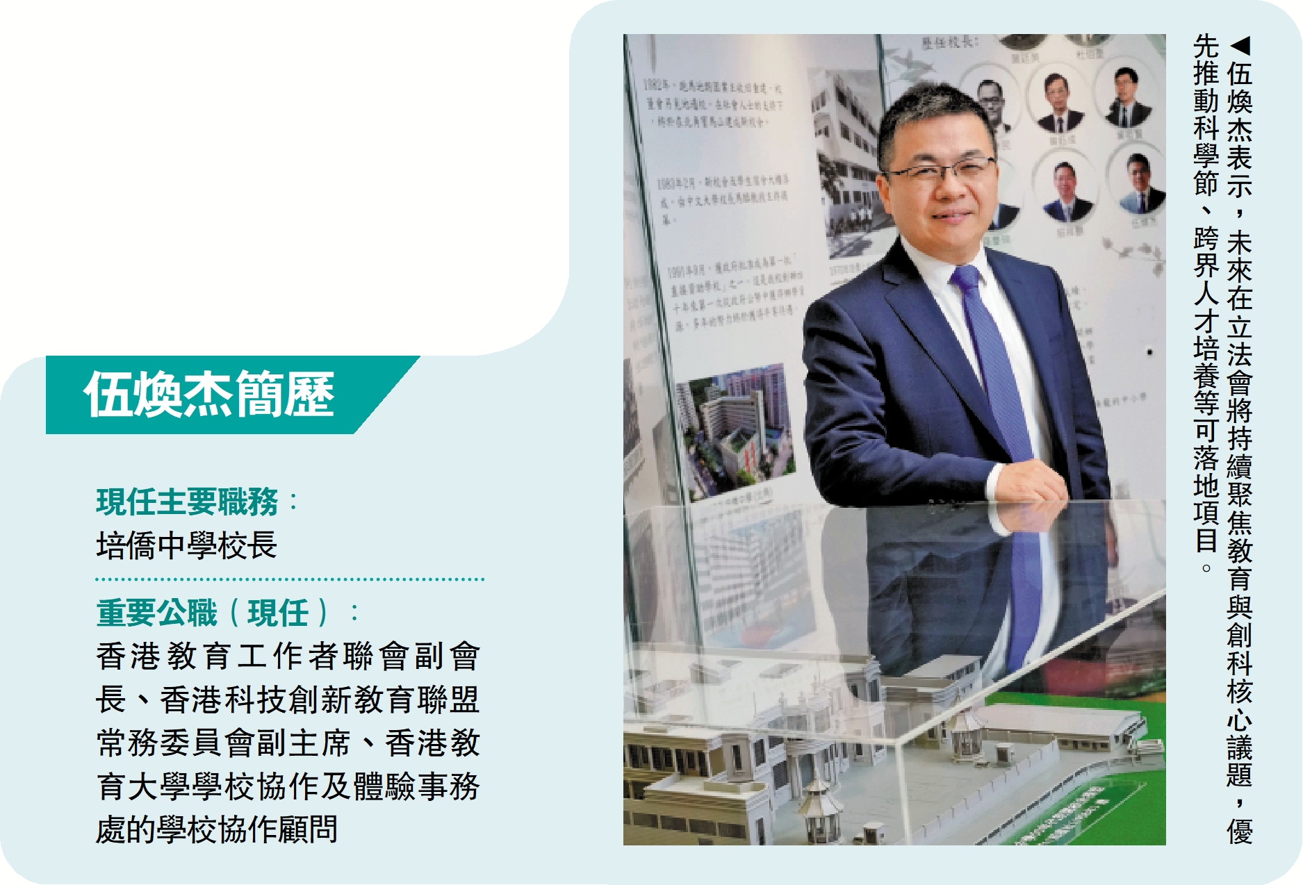 「教育最重要的,是培養『終身學習』的能力。」伍煥杰說,「好似跑步,目標不是衝過某個終點,而是令自己愈跑愈健康。學習亦然,不是為某天可以停,而是搵到學習方法,去學更多、更難的知識。」第八屆立法會選舉,培僑中學校長伍煥杰以1164票當選選委會界別議員,他形容參選是一次終身學習的實踐。