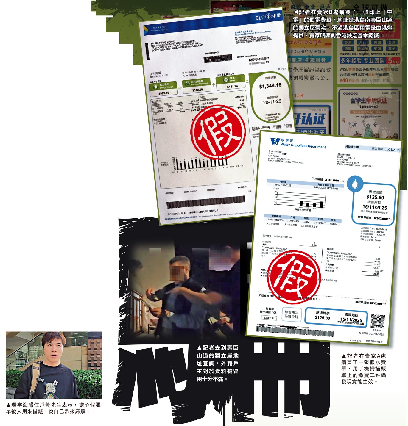 記者編造一個名字,賣家用了一小時,便將水、電費單及銀行賬單的PDF版發送過來,三張賬單上確實寫着記者所提供的姓名,仔細看亦找不到破綻,且三張賬單上的時間竟都是該月份(11月)最新發出的。用手機掃描賬單上的繳費二維碼亦能生效,與賬單上的號碼完全能夠對得上,可謂毫無破綻。