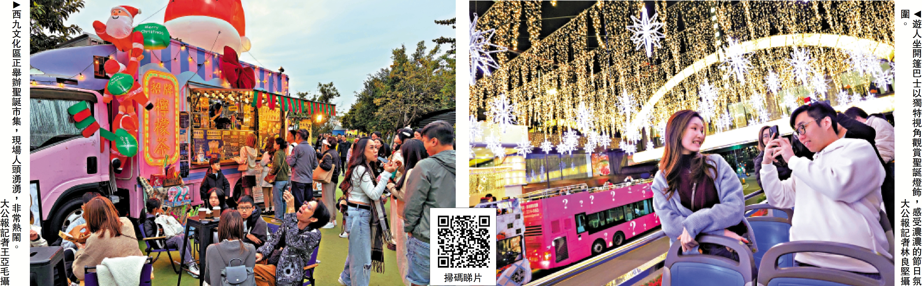 在西九文化區的「聖誕森林」,一棵高達12米的巨型聖誕樹,加上多棵小型聖誕樹,吸引大批遊人到來打卡。聖誕市集有十多個攤檔,售賣漢堡、爆穀、啤酒等,亦有狗仔玩具、飾品等;在西九碼頭附近的三、四部美食車,售賣串燒、燒賣、多士等小食及甜品等。大公報記者昨日下午在現場所見,市集內每個攤檔前都是人山人海,美食車有小食攤檔前有十多人排隊。西九文化區需實施單向人流管制,下午5時左右,現場貼出告示,排隊入場需超過兩小時。
