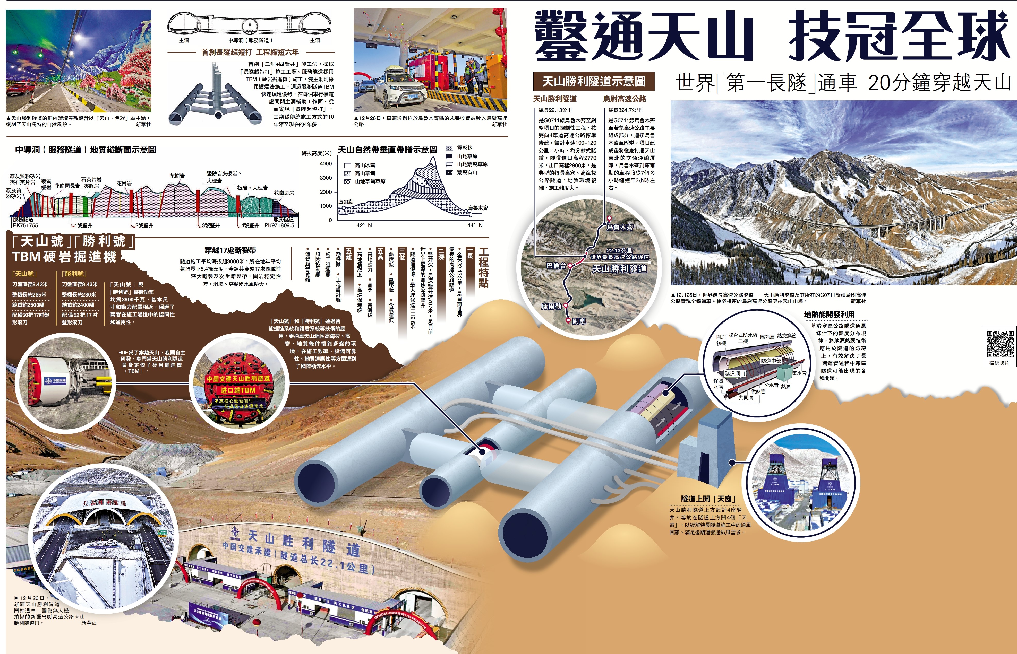 12月26日上午,世界最長高速公路隧道──天山勝利隧道通車,該隧道穿越天山中部直連新疆南北,將原來數小時的盤山路縮短到約20分鐘。這也標誌着新疆烏魯木齊至尉犁的G0711高速公路(烏尉高速)全線投入使用,讓地處北疆的自治區首府烏魯木齊至南疆重鎮庫爾勒的駕車時長,從以往的7小時大幅壓縮至3小時。天山築路,中國再創造隧道建設的世界新奇跡。\大公報記者 應江洪
