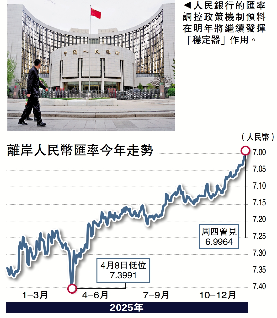 今年人民幣兌美元匯率「先抑後揚」,隨着中美關稅談判獲得階段性共識成果,以及中國經濟增長韌性的越發顯現,下半年以來人民幣匯率持續走強。此外,美聯儲12月落實降息後,美匯指數走弱,離岸人民幣近日更升穿7算。分析稱,中國有望提高人民幣匯率管理的靈活性,避免主動使用人民幣匯率作為應對外部不確定性的工具。明年人民幣匯率料將繼續在均衡水平保持基本穩定,明年底有望升至6.8水平。