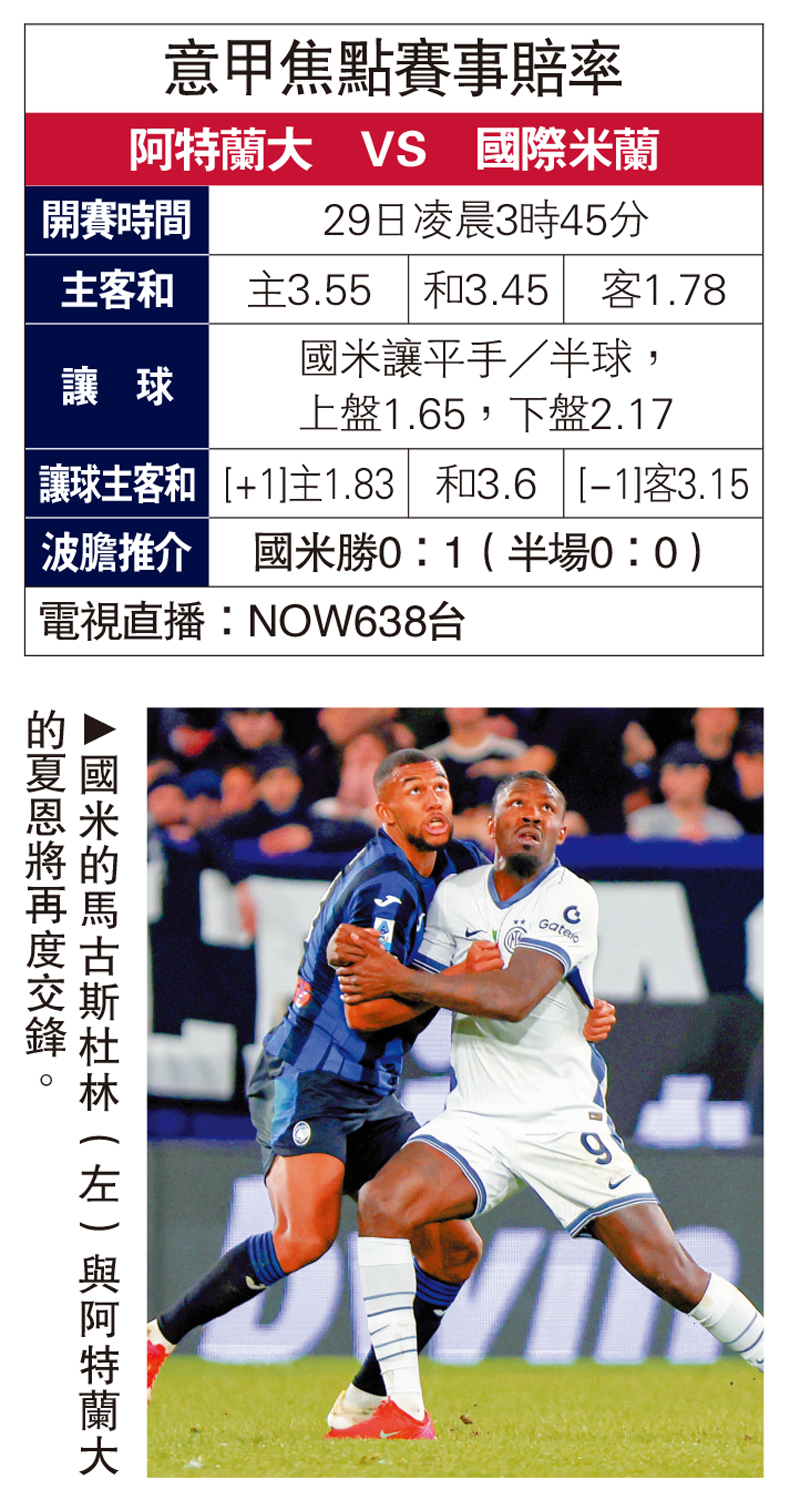 【大公報訊】意甲阿特蘭大主場對國際米蘭明晨開打,雖然主隊近況的確不錯,但國際米蘭今季有更出色的表現,目前更高居意甲聯賽榜榜首,更重要的是雙方對賽成績完全由國米壓倒性佔優,為求保住榜首位置,國米今仗相信亦會全力出擊爭取3分。讓球國米讓平/半不多,買上盤勝算較高。(NOW638台明天凌晨3時45分直播)