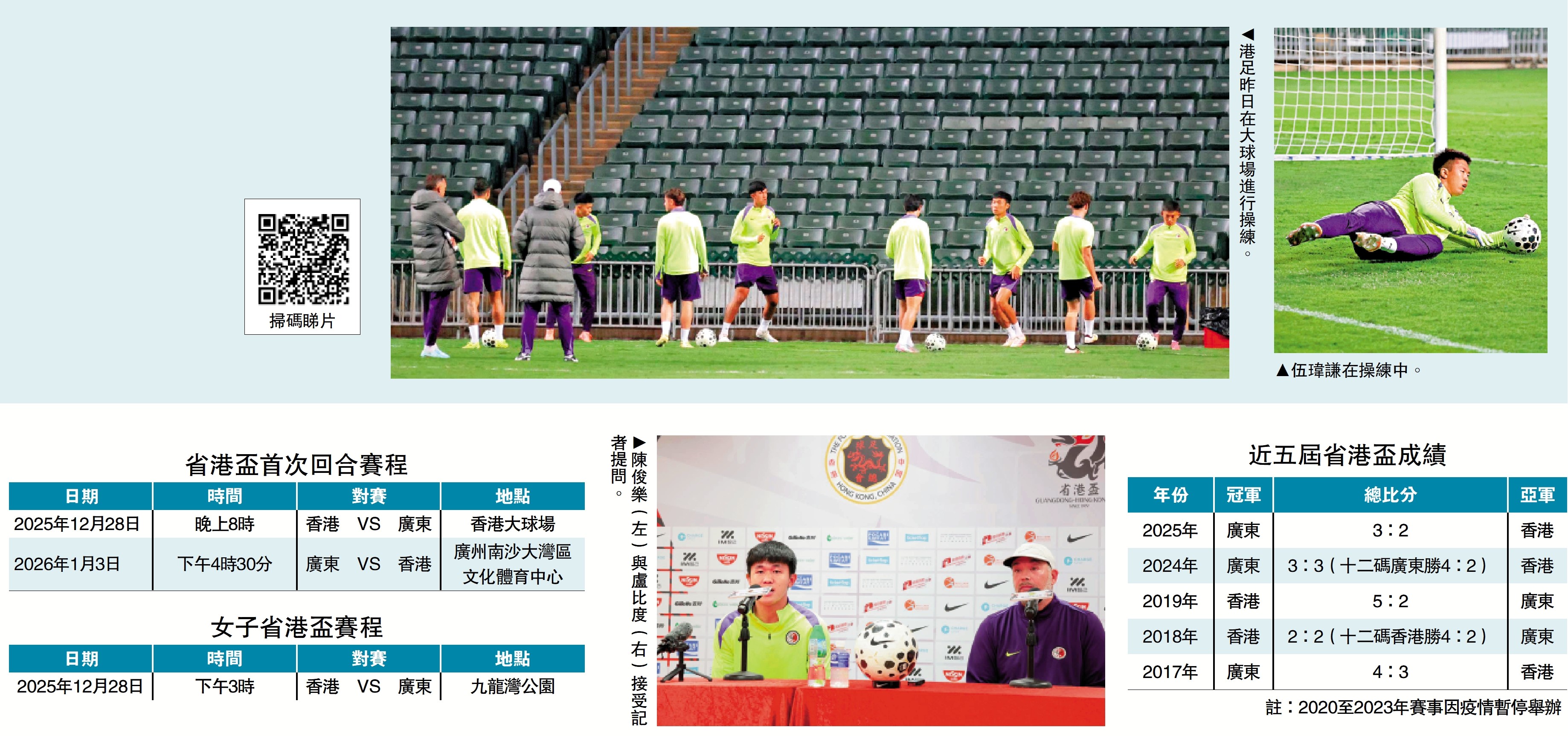 第44屆省港盃首回合賽事28日晚上8時在香港大球場上演,香港男子足球隊由暫代主教練盧比度領軍,力爭重奪失落兩屆的錦標。港隊昨日在香港大球場進行賽前最後一課操練,艾華頓、祖連奴、孫銘謙等一眾主將在寒風中積極操練,力爭以最佳狀態爭取佳績。盧比度籲球迷入場為港足加油助威,營造震撼的主場優勢。\大公報記者 朱家立(文、圖)