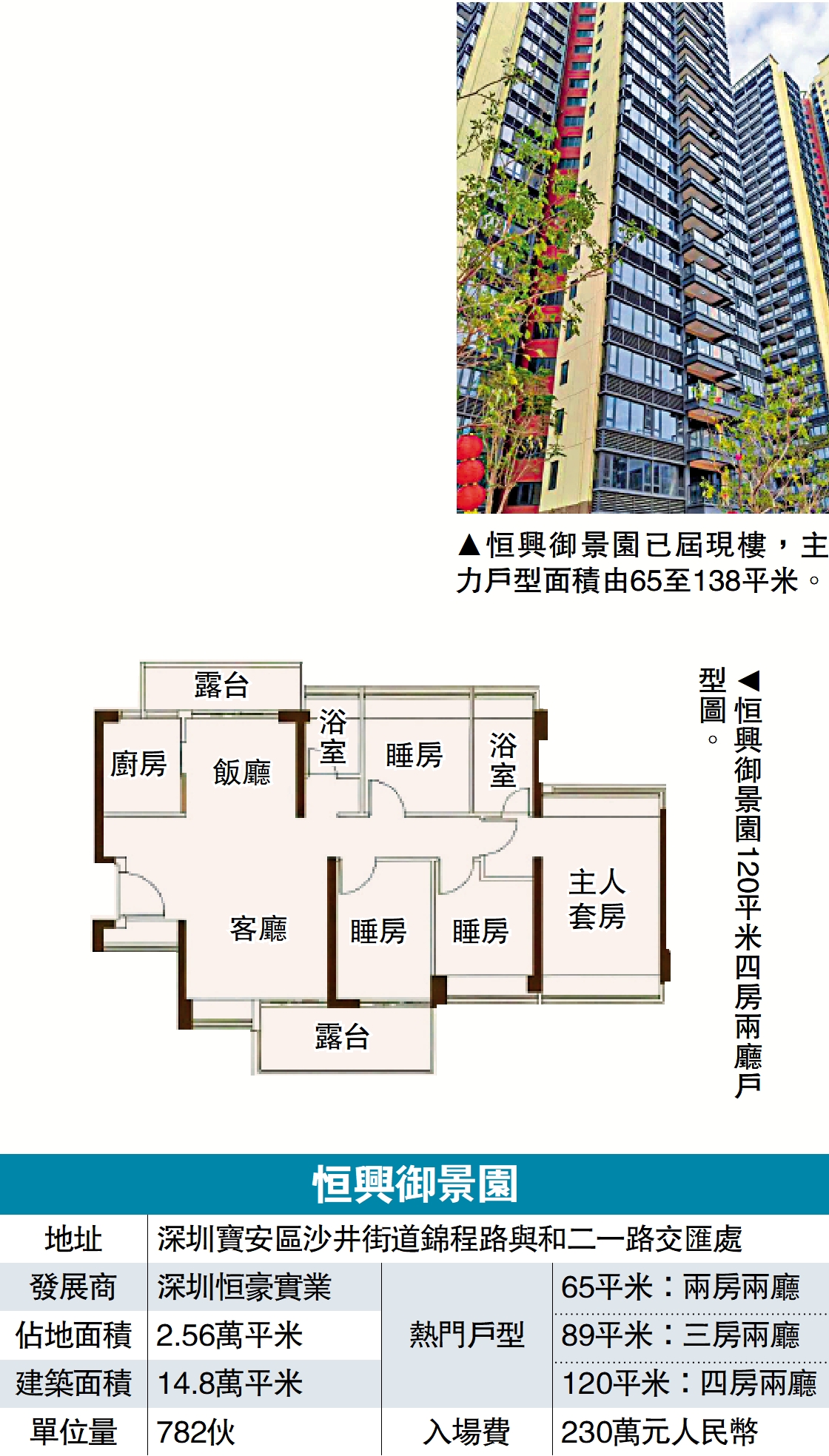 項目由6幢住宅樓組成,提供782伙,備案每平米均價4.79萬元(人民幣,下同),折後3.4萬至4.8萬元。主力戶型涵蓋65平米兩房戶,總價約230萬元;89平米三房戶總價約310萬元;以及120平米四房戶總價約480萬元,實用率79%,精裝交付。項目為現樓銷售,避免樓花爛尾風險。
