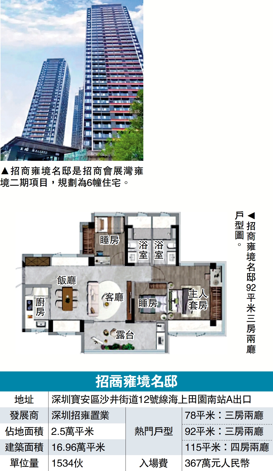 招商雍境名邸佔地2.5萬平米,總建築面積16.96萬平米,規劃為6幢高層住宅及1所4層高幼兒園,提供1534伙,其中商品住宅佔804伙,保障性住房佔730伙。項目首推195伙,包括面積78至92平米三房、115平米四房等新規產品,入場費367萬元人民幣(約405萬港元)。