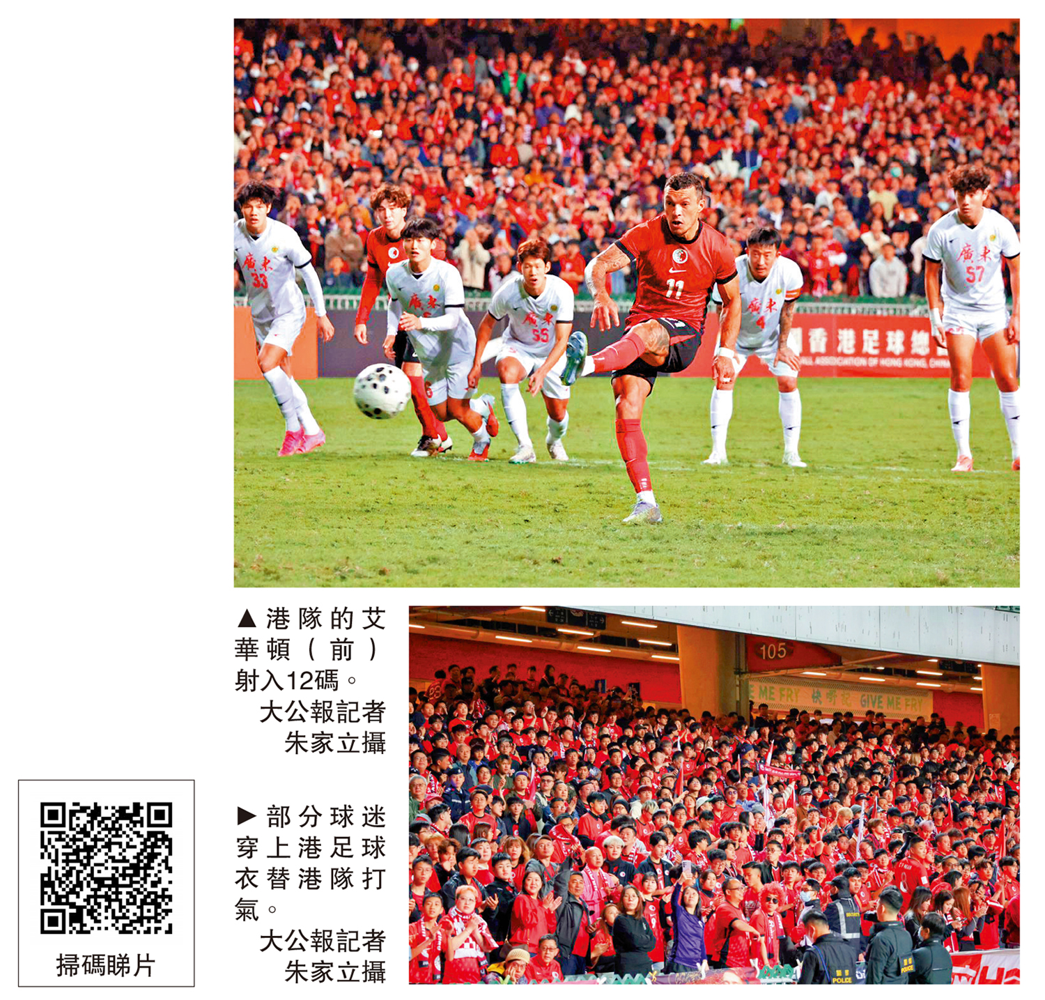 【大公報訊】記者朱家立報道:第44屆省港盃首回合賽事28日在香港大球場上演首回合賽事,由暫代主教練盧比度領軍的香港男子足球隊對陣廣東隊。7703名球迷入場打氣,不少更揮舞紅色港足旗幟,展現「紅海氣勢」。港足最終以2:2逼和9人作戰的廣東隊。雙方將在明年1月3日下午4時30分在廣州南沙大灣區文化體育中心舉行次回合賽事。