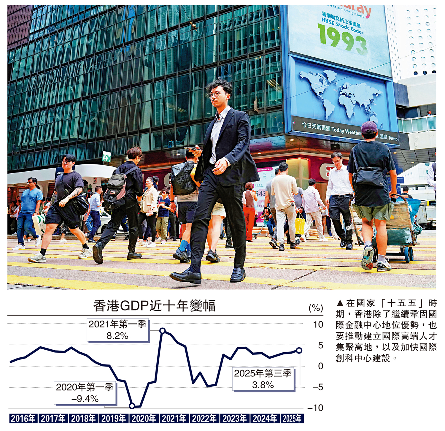 「十五五」規劃建議中,在「促進香港長期繁榮穩定」部分提出「促進港澳經濟社會發展」以及「支持香港更好融入和服務國家發展大局」等,有清晰的戰略部署,對香港所發揮的功能角色賦予了新的內容和內涵,這也是香港在「十五五」時期緊密對接國家「十五五」規劃的戰略機遇。