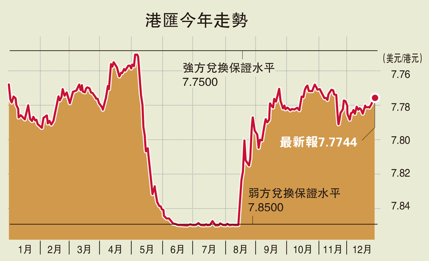 隨後,弱方兌換保證於6月底至8月中期間被觸發十二次。金管局合共買入1199億元,銀行總結餘也逐步下降至8月底的541億元。由於總結餘減少並推高港元利率,港元匯率逐步由弱方兌換保證匯率水平回復至兌換範圍內。截至今年12月底,總結餘約為533億元。