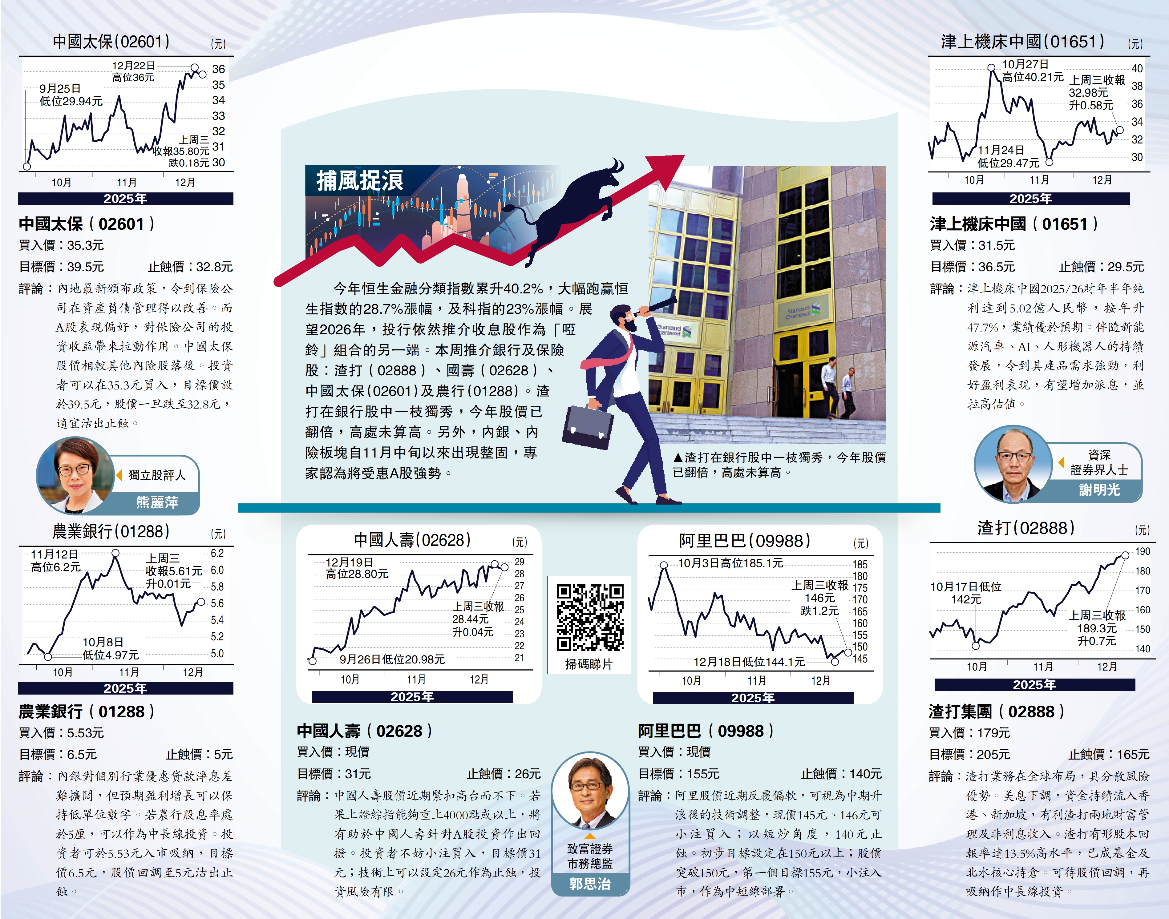 今年恒生金融分類指數累升40.2%,大幅跑贏恒生指數的28.7%漲幅,及科指的23%漲幅。展望2026年,投行依然推介收息股作為「啞鈴」組合的另一端。本周推介銀行及保險股:渣打(02888)、國壽(02628)、中國太保(02601)及農行(01288)。渣打在銀行股中一枝獨秀,今年股價已翻倍,高處未算高。另外,內銀、內險板塊自11月中旬以來出現整固,專家認為將受惠A股強勢。